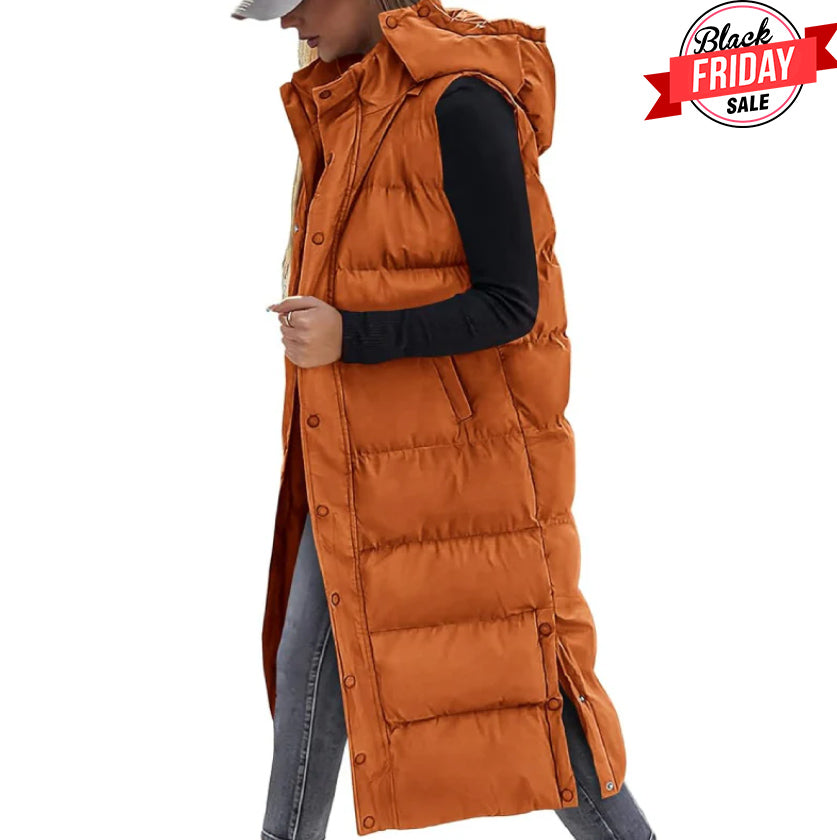 Women's Long Puffer Vest with Quilted Hood & Button Down Closure