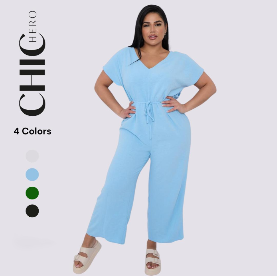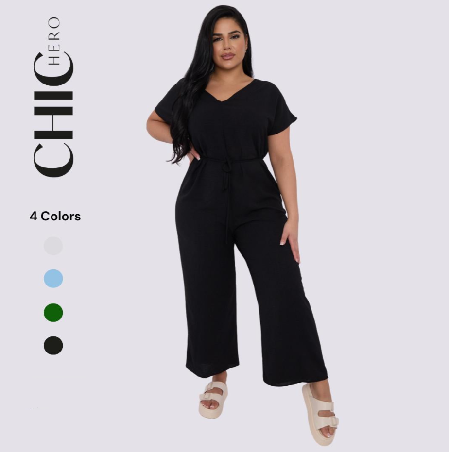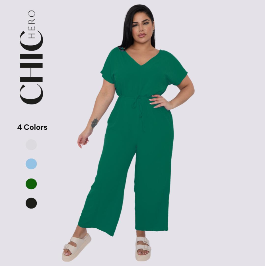 Plus Size V-neck Short-Sleeved Waist Drawstring Solid Color Jumpsuit