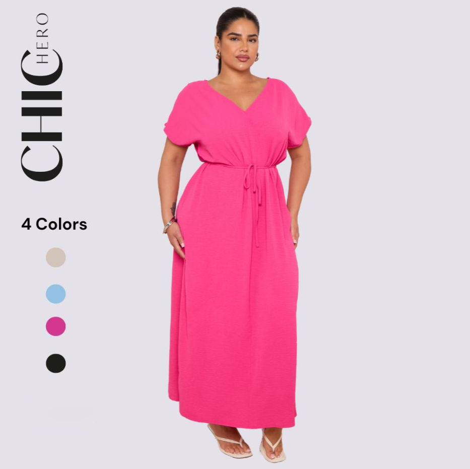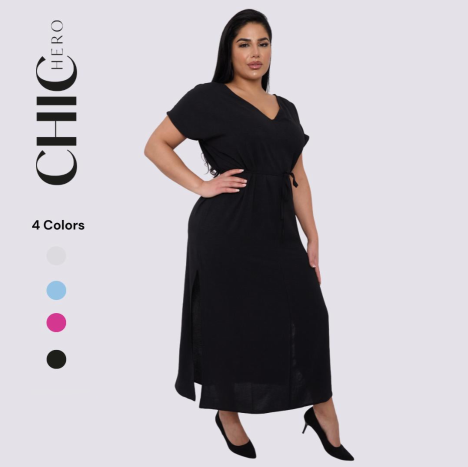Plus size V-neck Short Sleeve Waist Drawstring Solid Color Dress