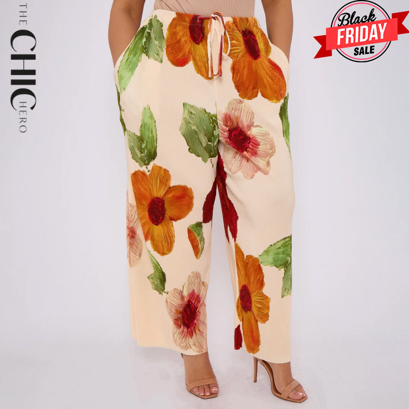 Abstract Floral Wide-Leg Drawstring Pleated Trousers With Pockets