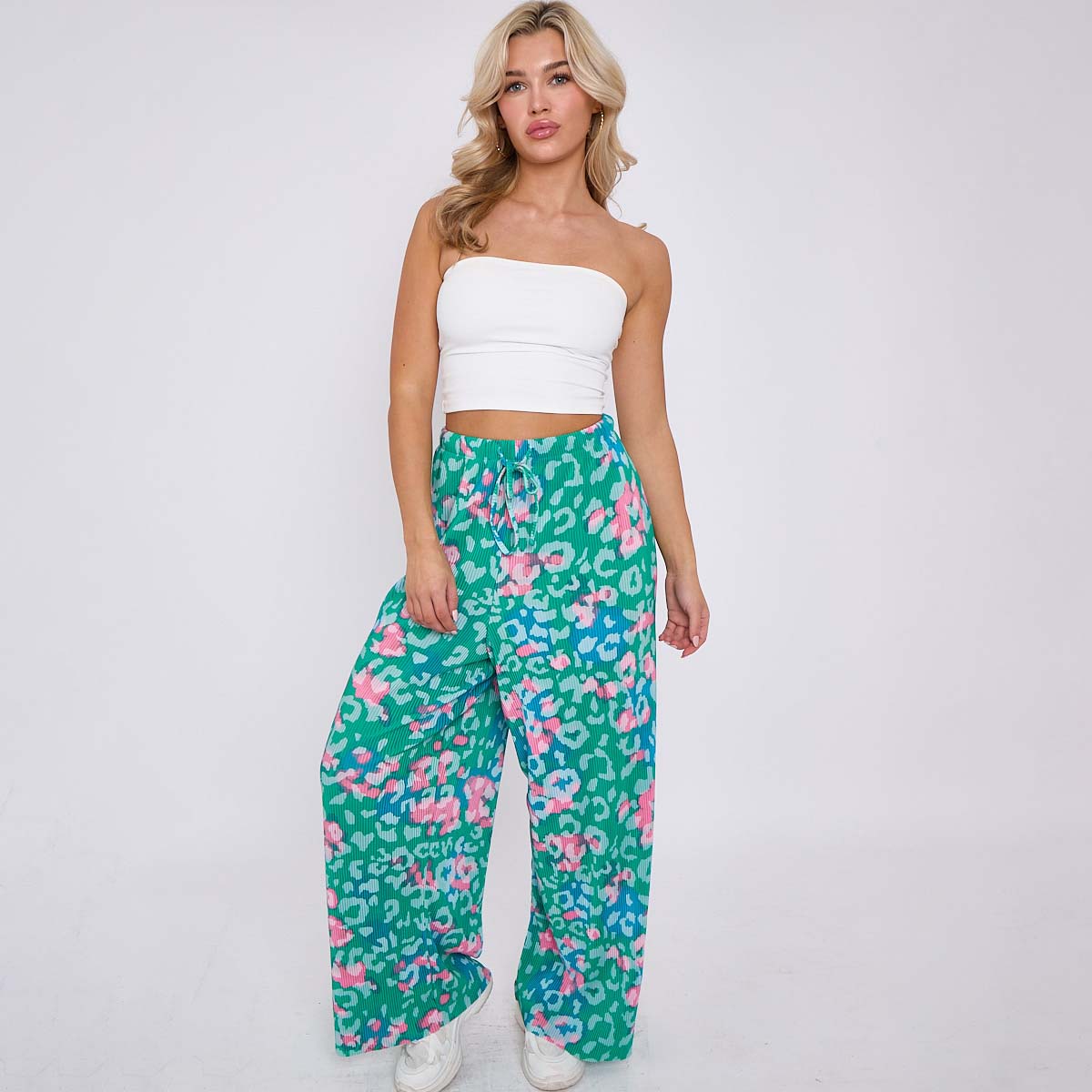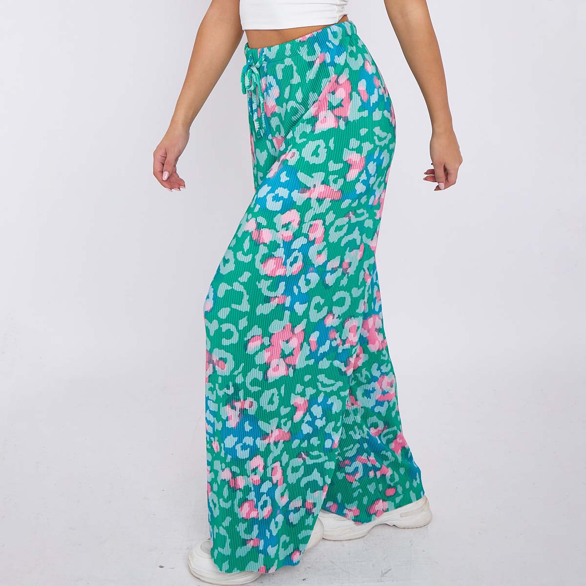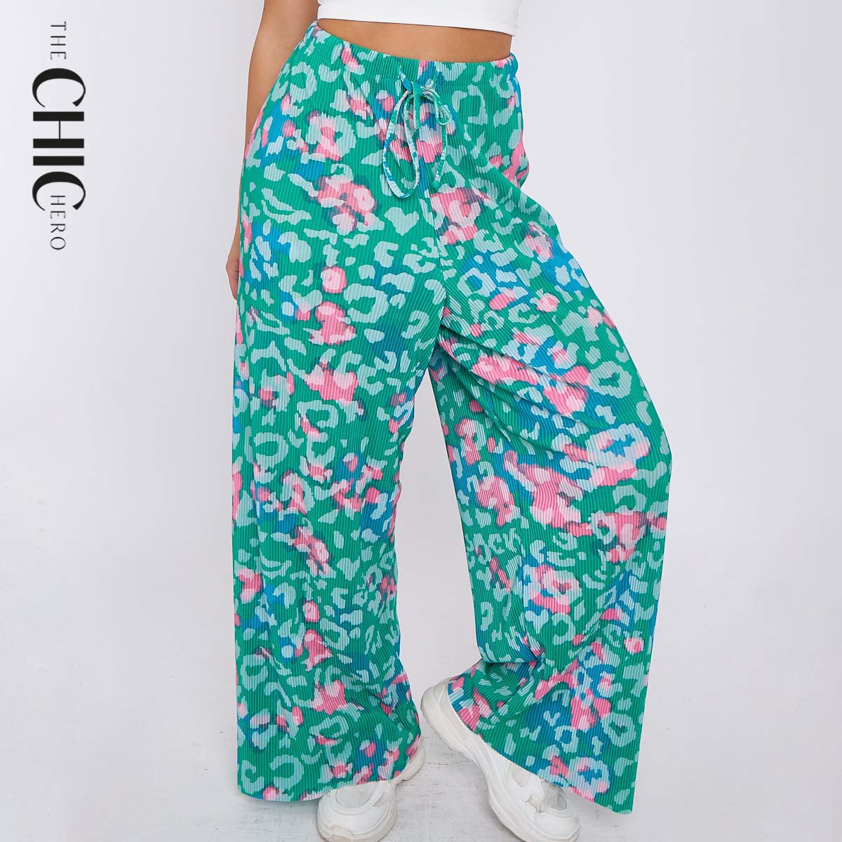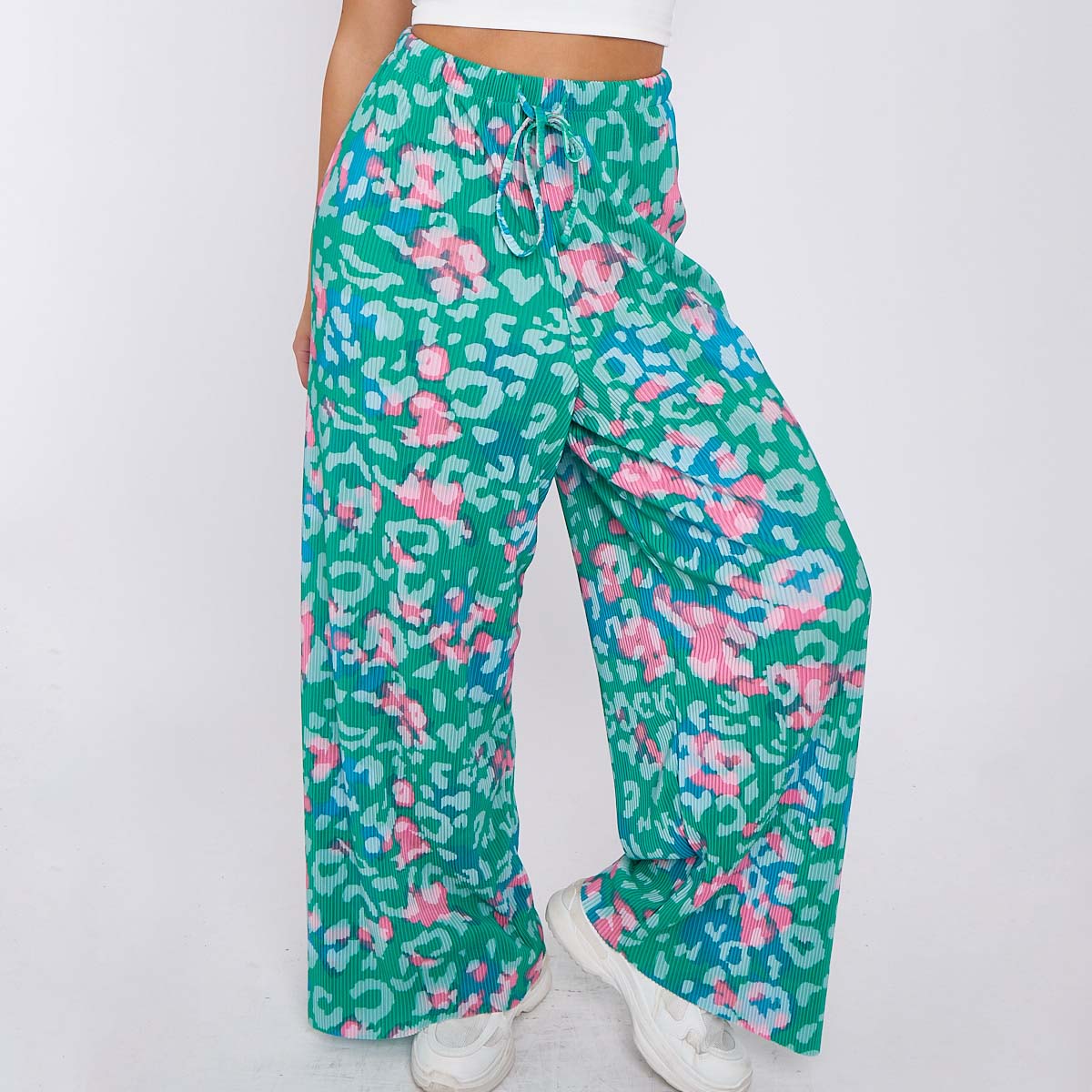Green Print Abstract Wide-Leg Drawstring Palazzo Pleated Pants