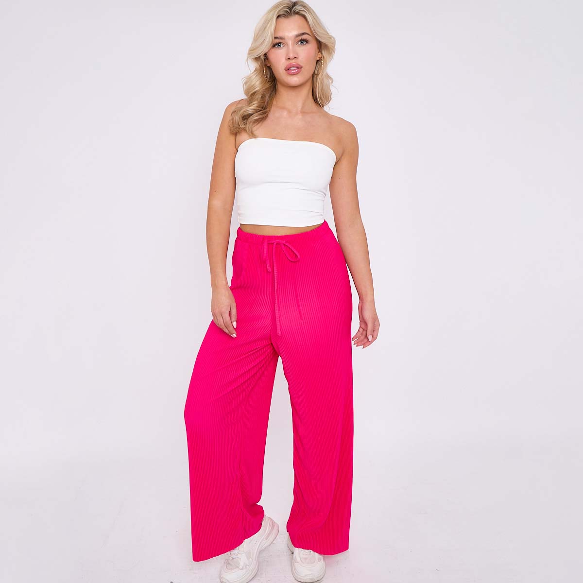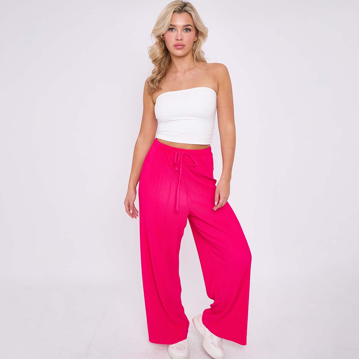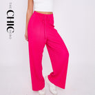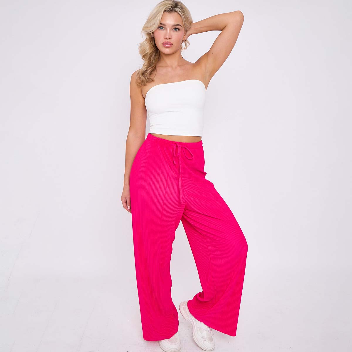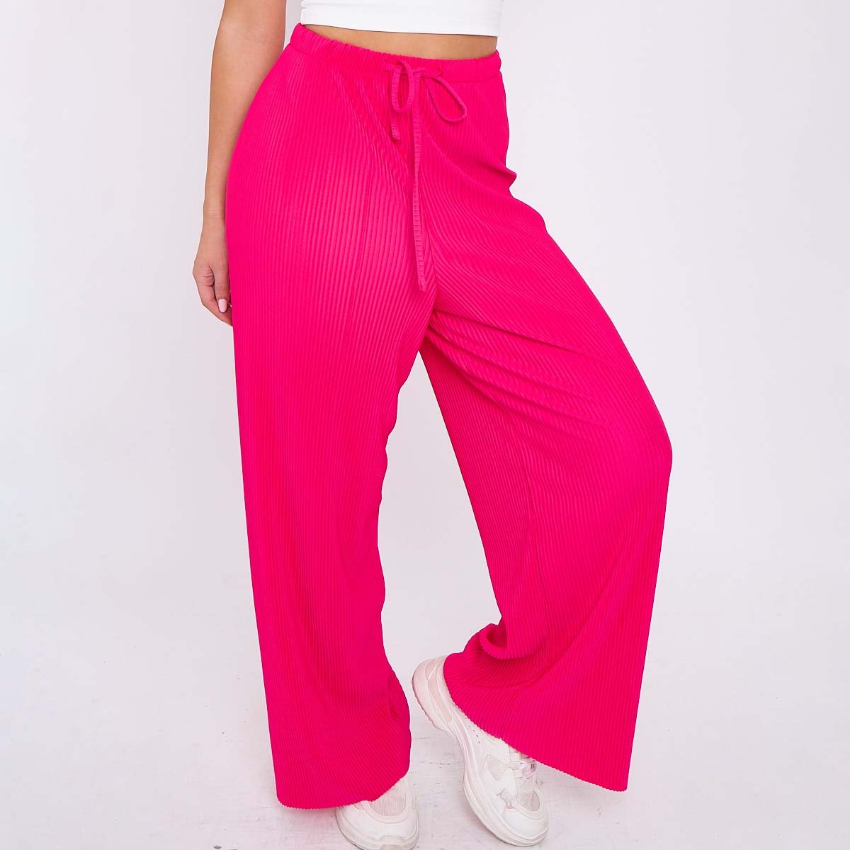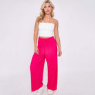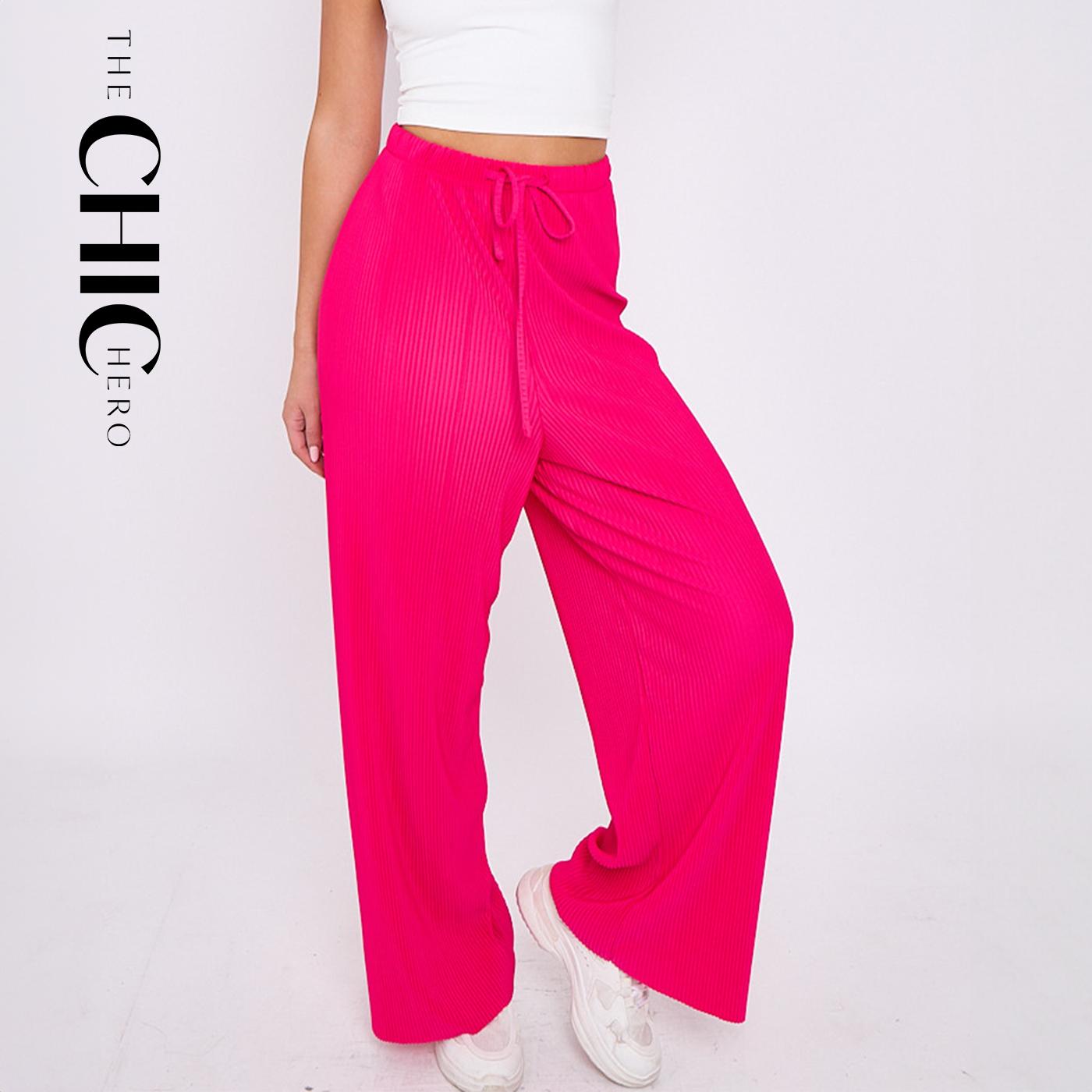 Pink Solid Color Magenta Wide-Leg Drawstring Pants Palazzo Pleated Pants