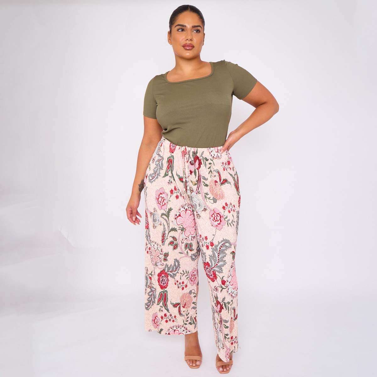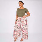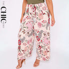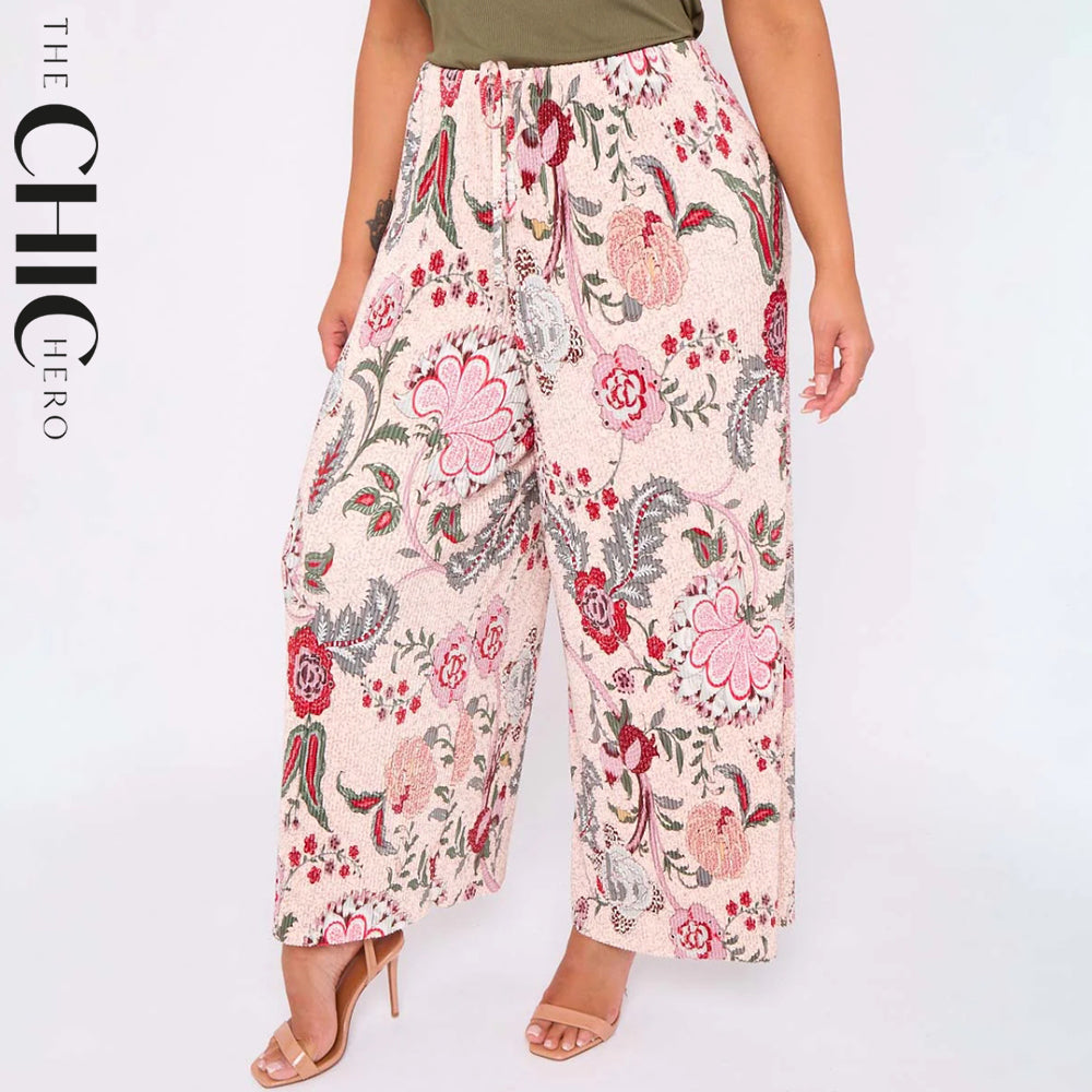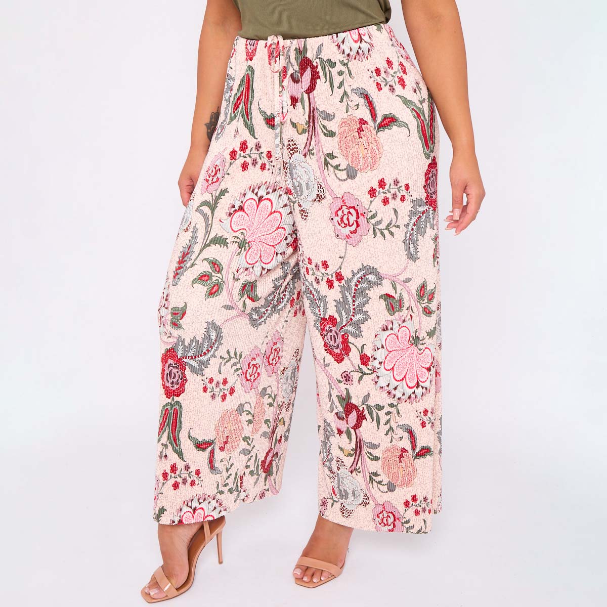 Pink Flower Abstract Print Wide-Leg Drawstring Palazzo Pleated Pants