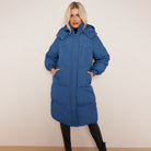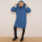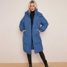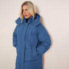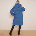 Blue Long Puffer Coat with Faux Fur Hood Longline Puffer Jacket