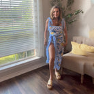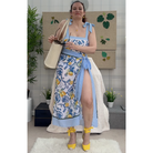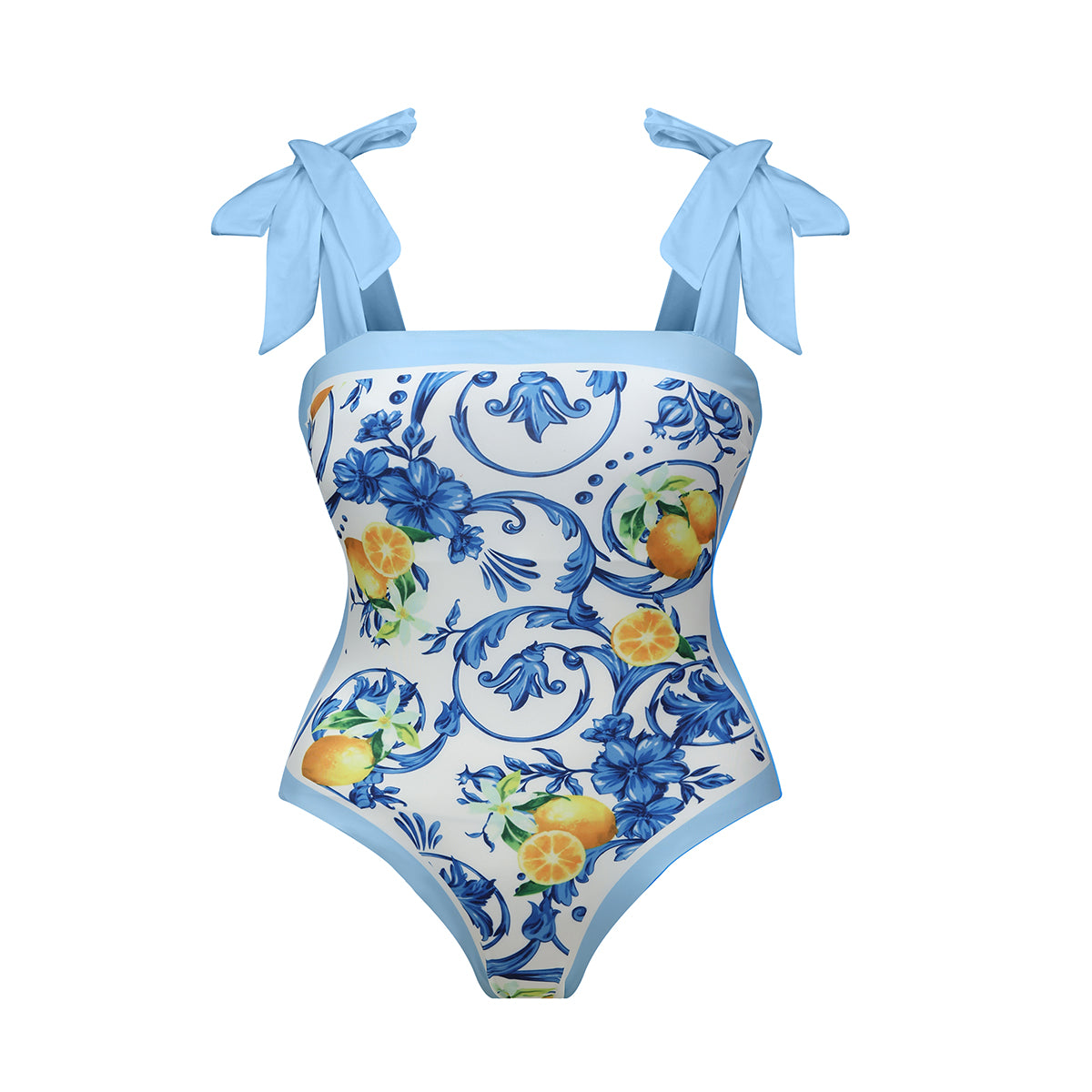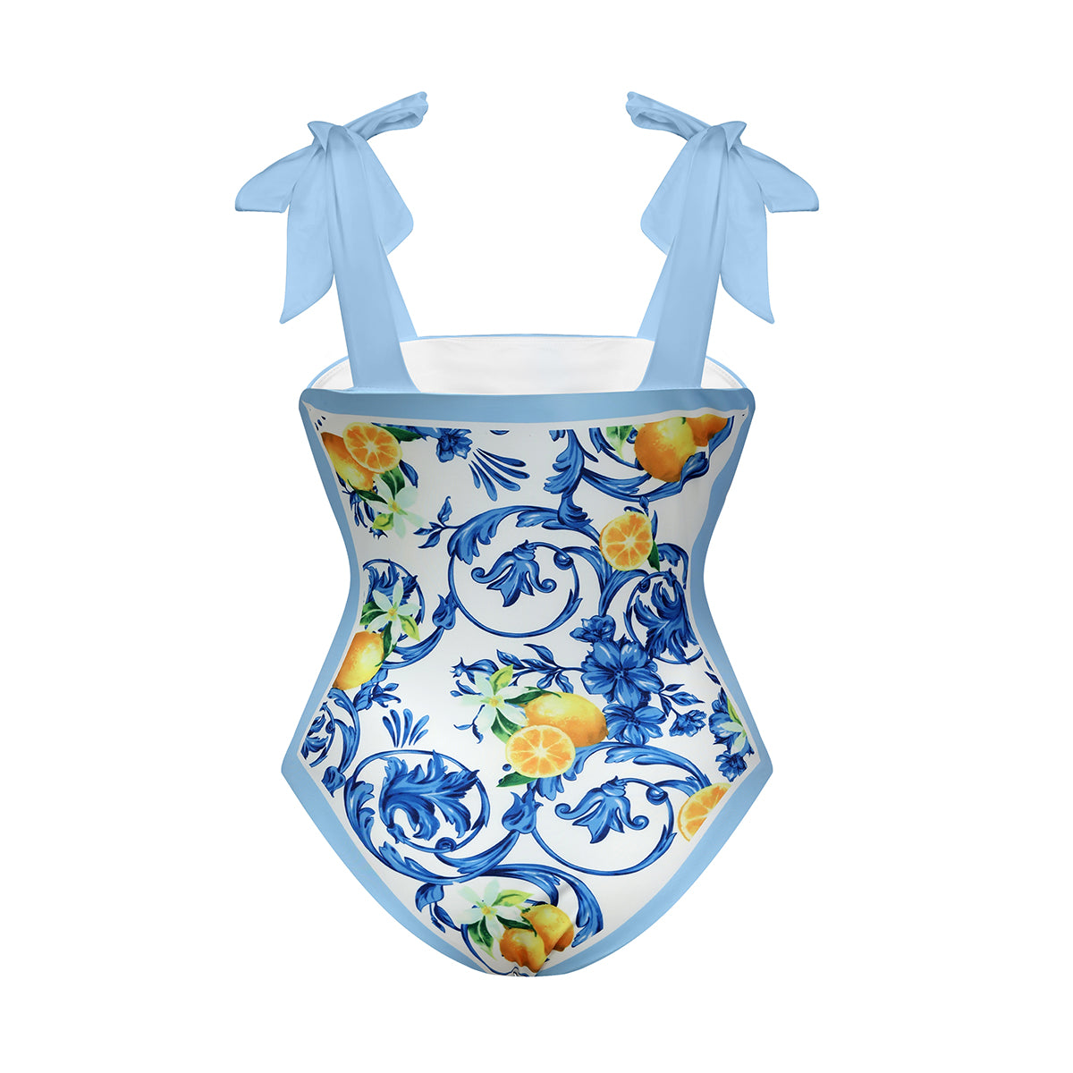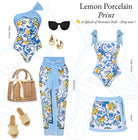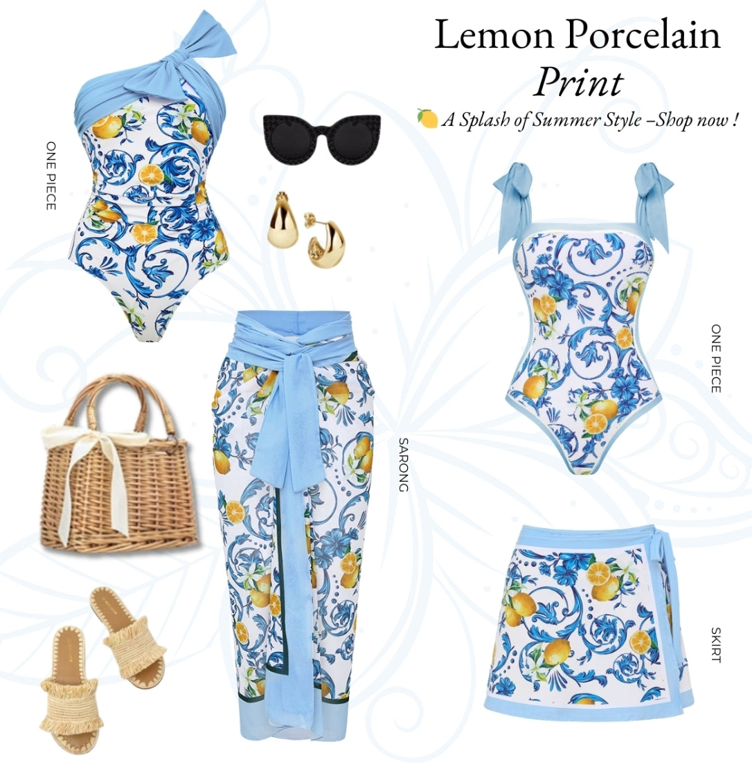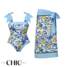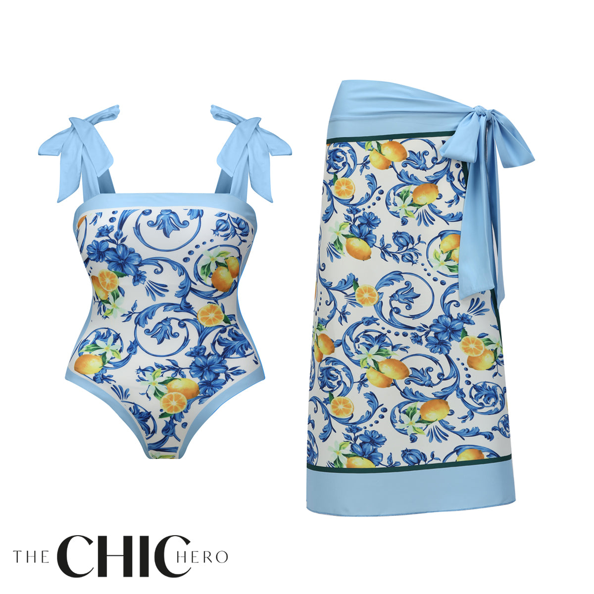 Blue Retro Lemon Florals One-Piece Swimsuit&Skirt
