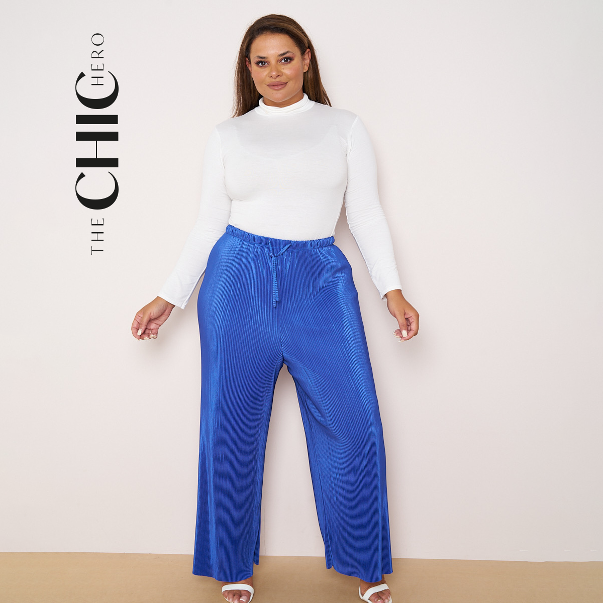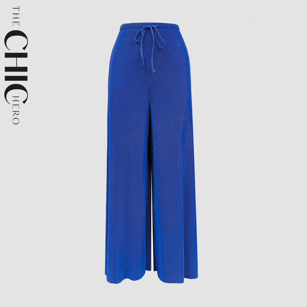 Blue Color Wide-Leg Drawstring Palazzo Pleated Pants