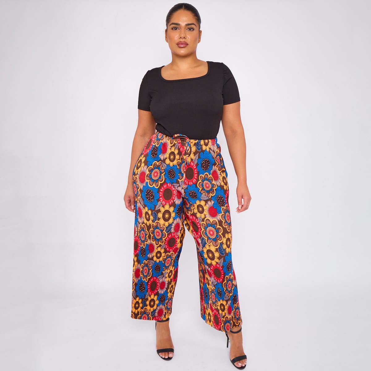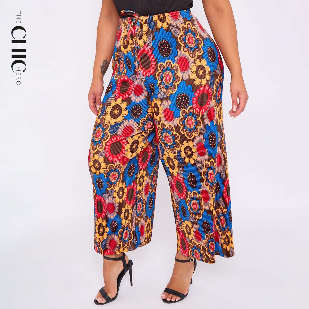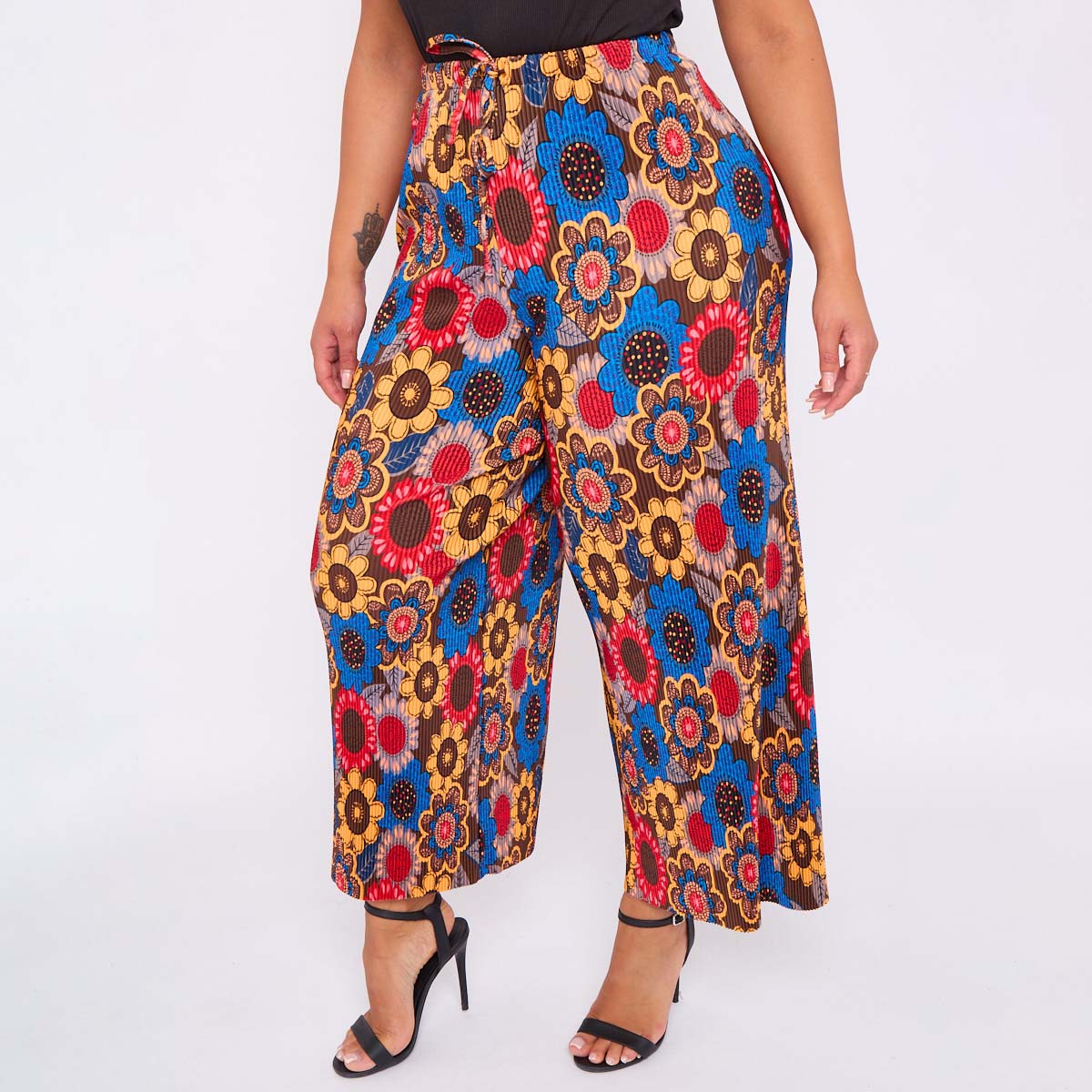 Sunflower Print Abstract Wide-Leg Drawstring Palazzo Pleated Pants