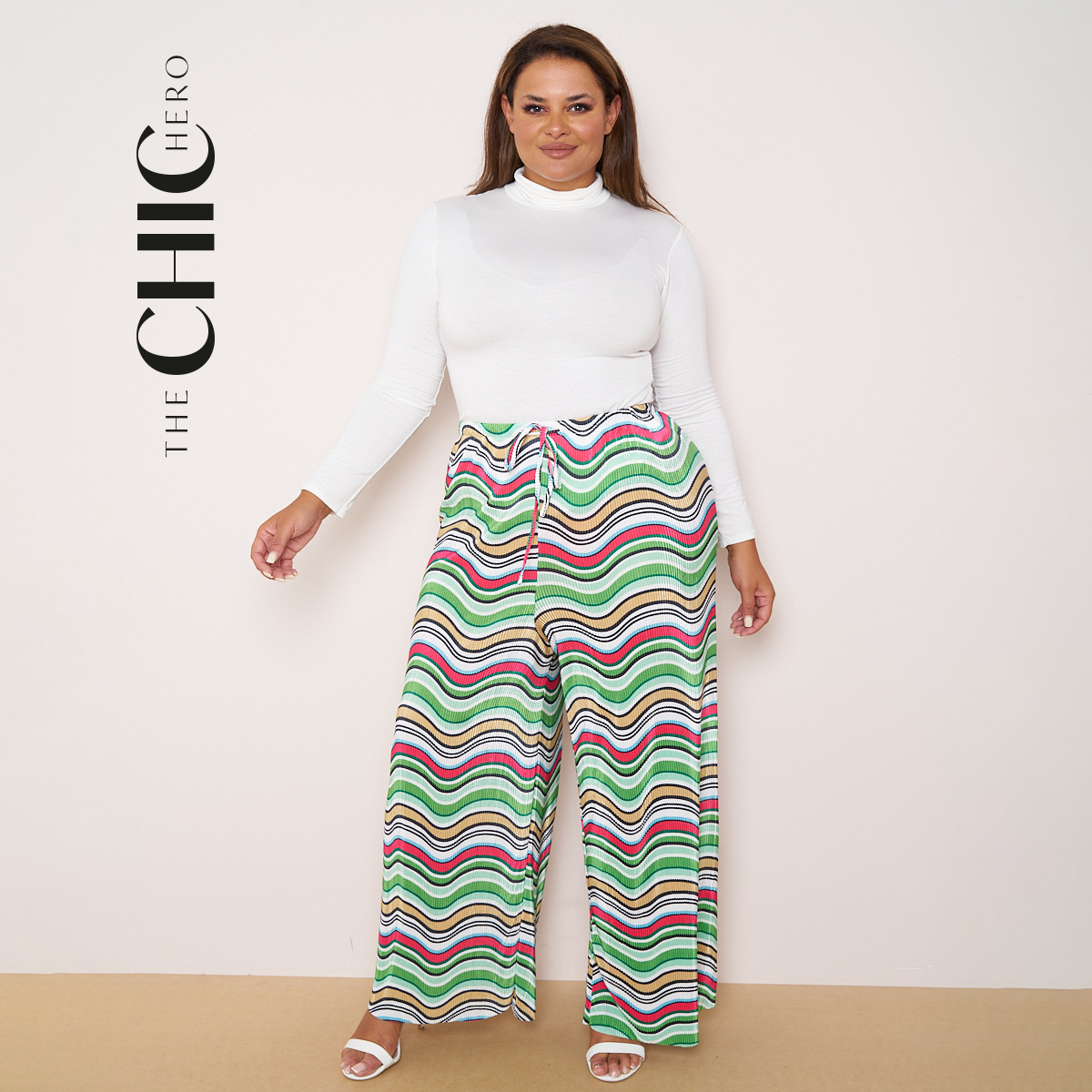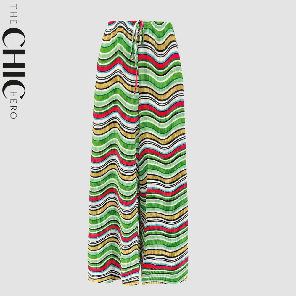 Green Curve Abstract Print Wide-Leg Drawstring Palazzo Pleated Pants