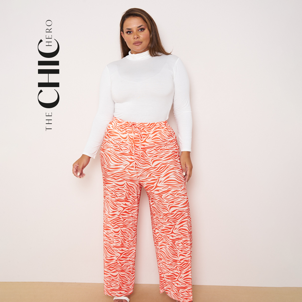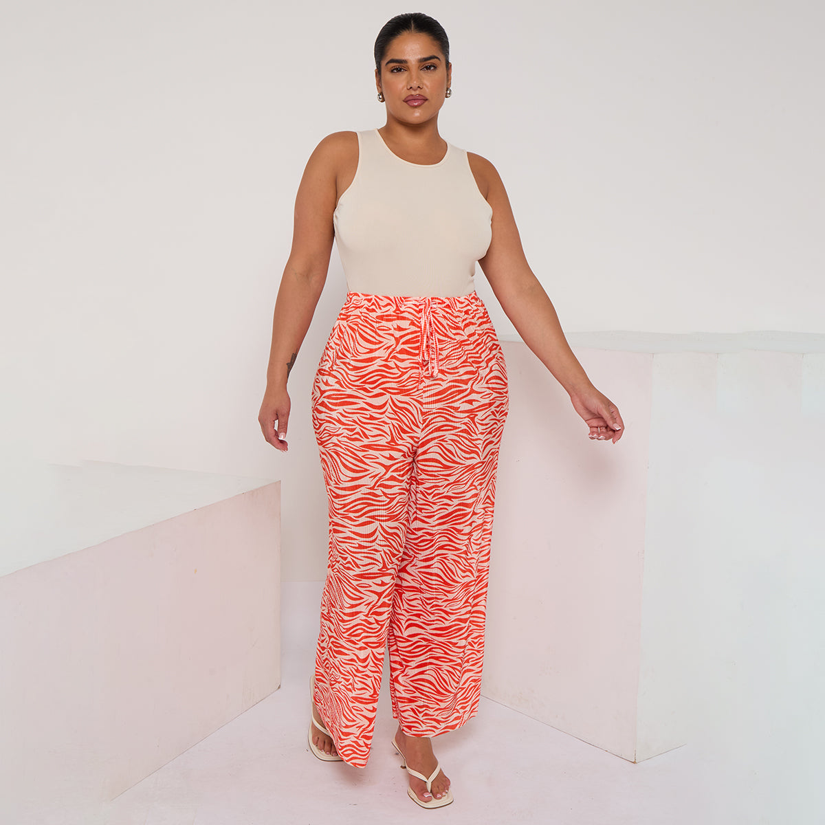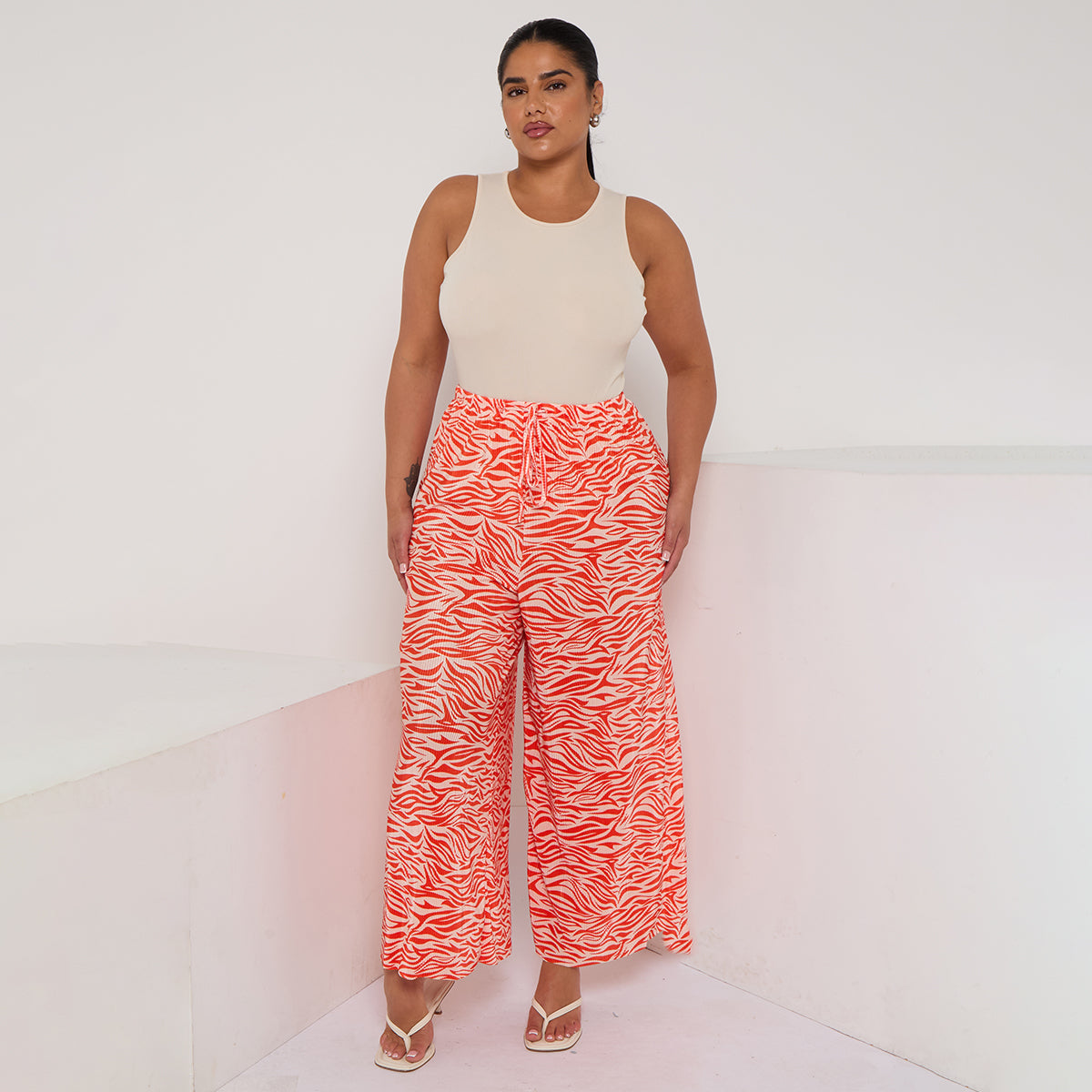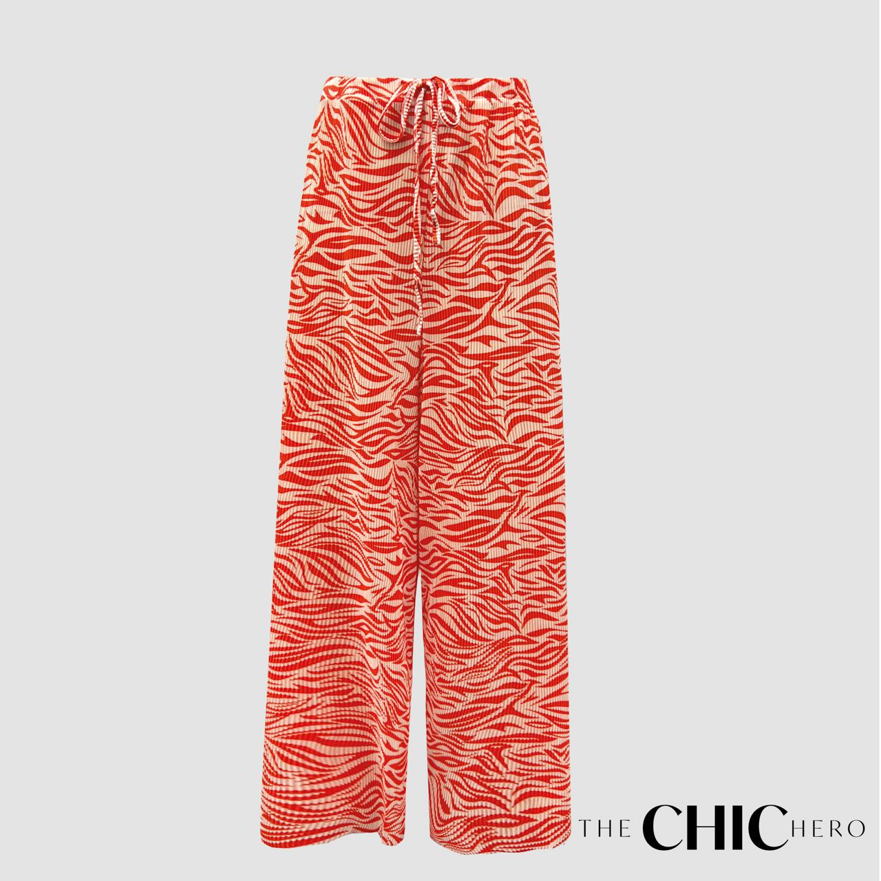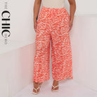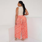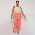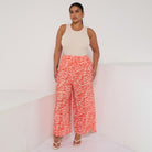 Orange Red Abstract Print Wide-Leg Drawstring Palazzo Pleated Pants