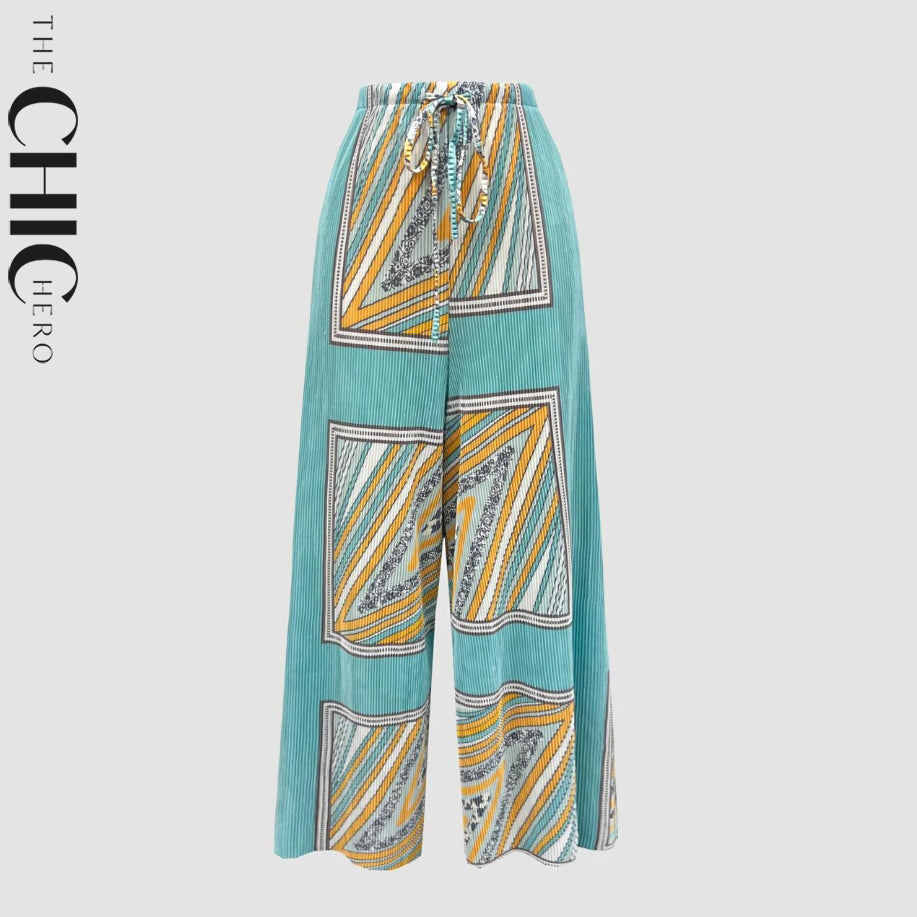 Bohemian Green Abstract Print Wide-Leg Drawstring Palazzo Pleated Pants