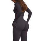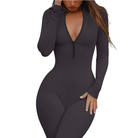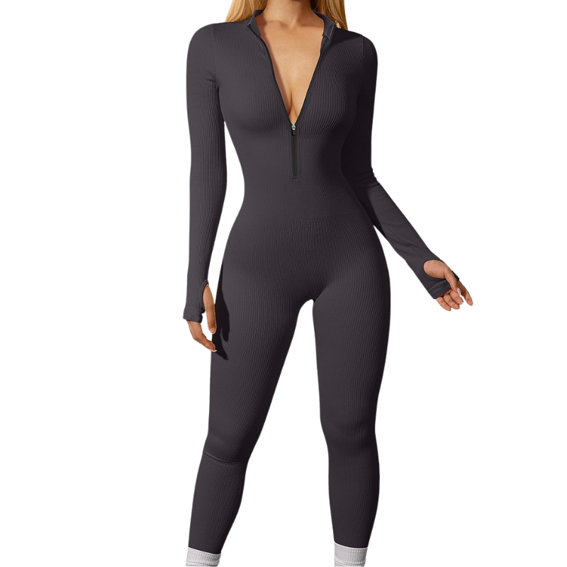 Dark Grey Ribbed Zipper Stand-Collar Long-Sleeve Slim-Fit Jumpsuit
