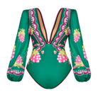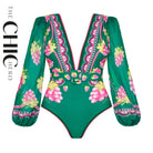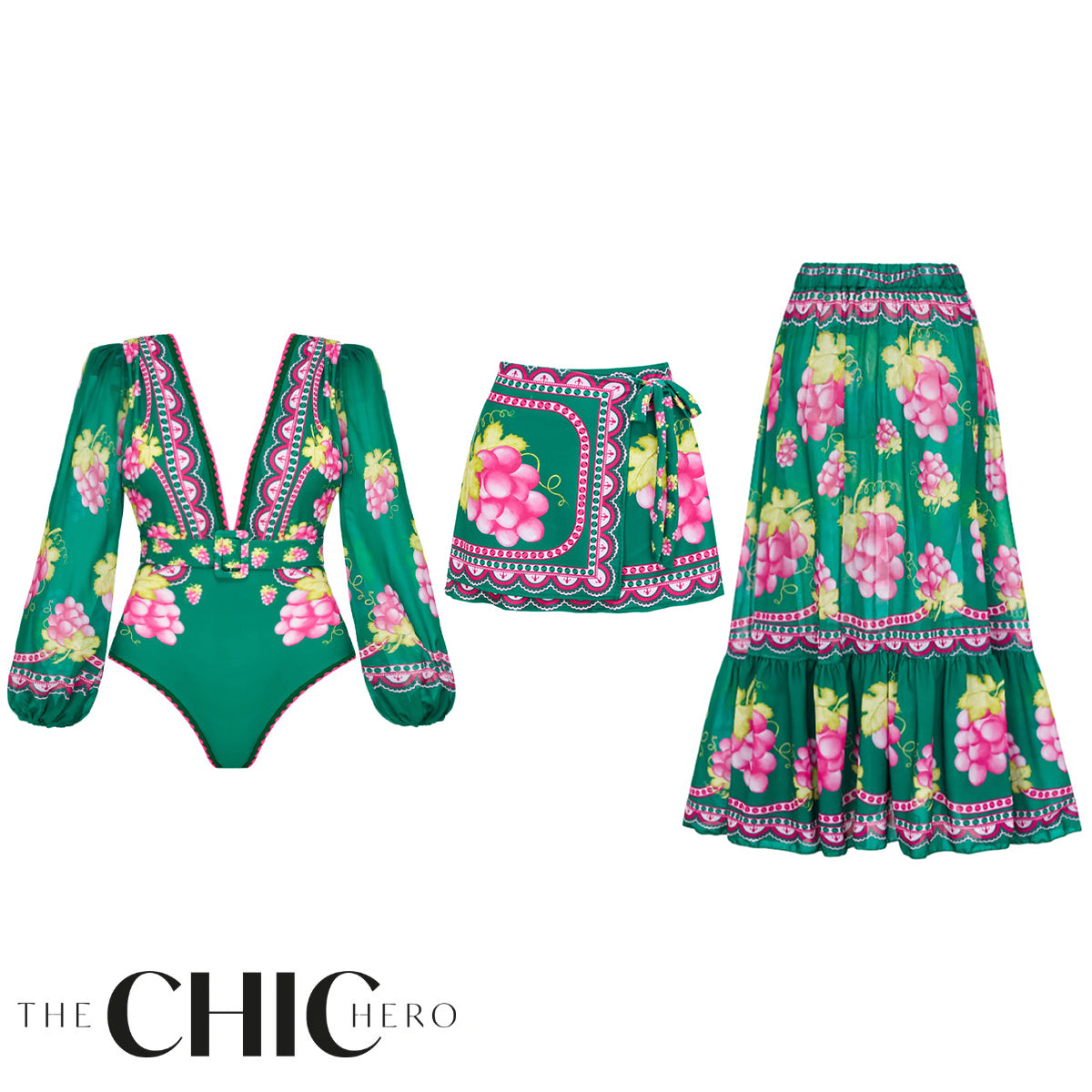 Green Grape Blossom Tropical Vineyard V-Neck Swimsuit & Skirt Set