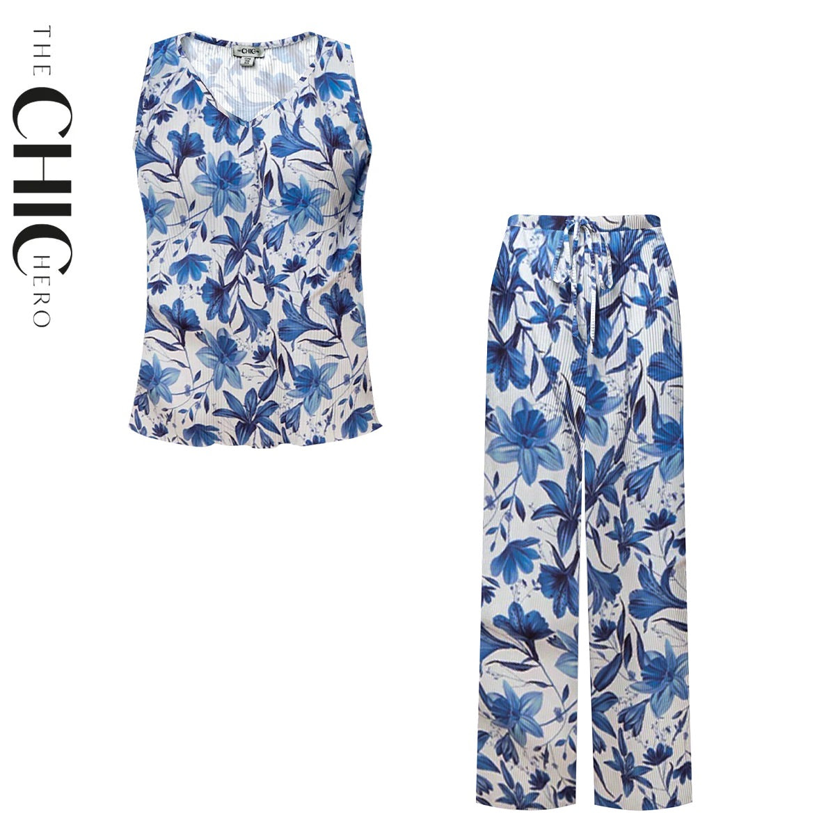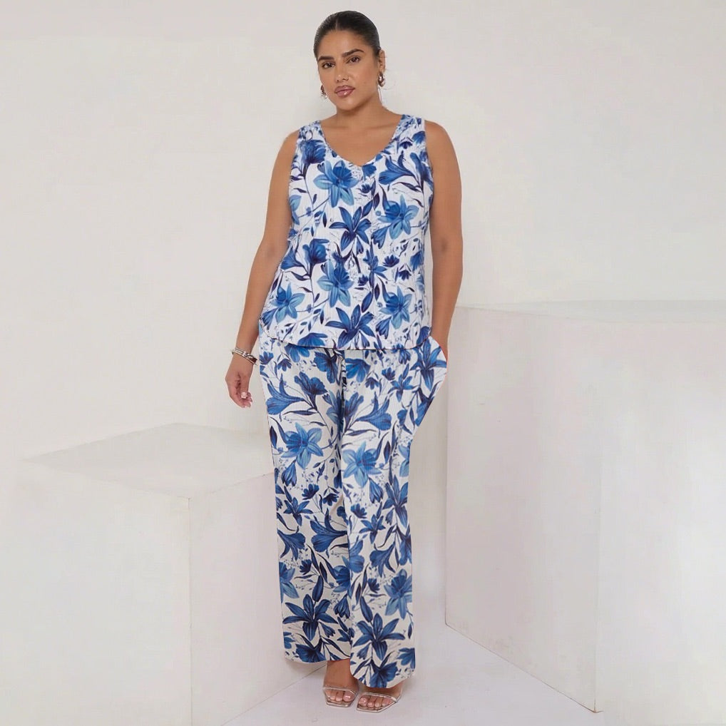 Boho Breeze Blue Floral V-Neck Vest Top & Pleated Pants