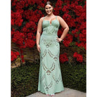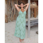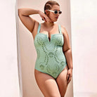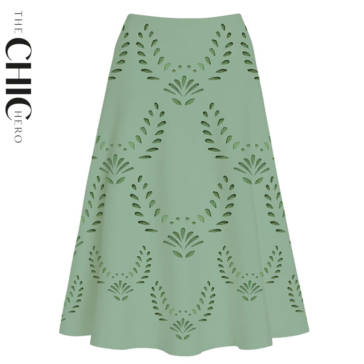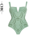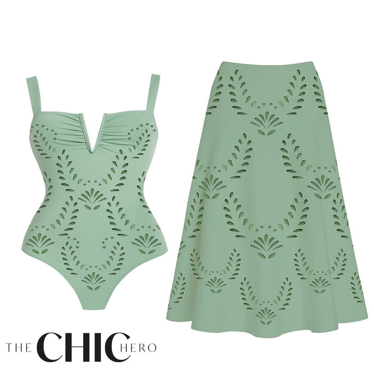 Mint Green Petal Print Hollow V Neck One-Piece Swimsuit&Skirt