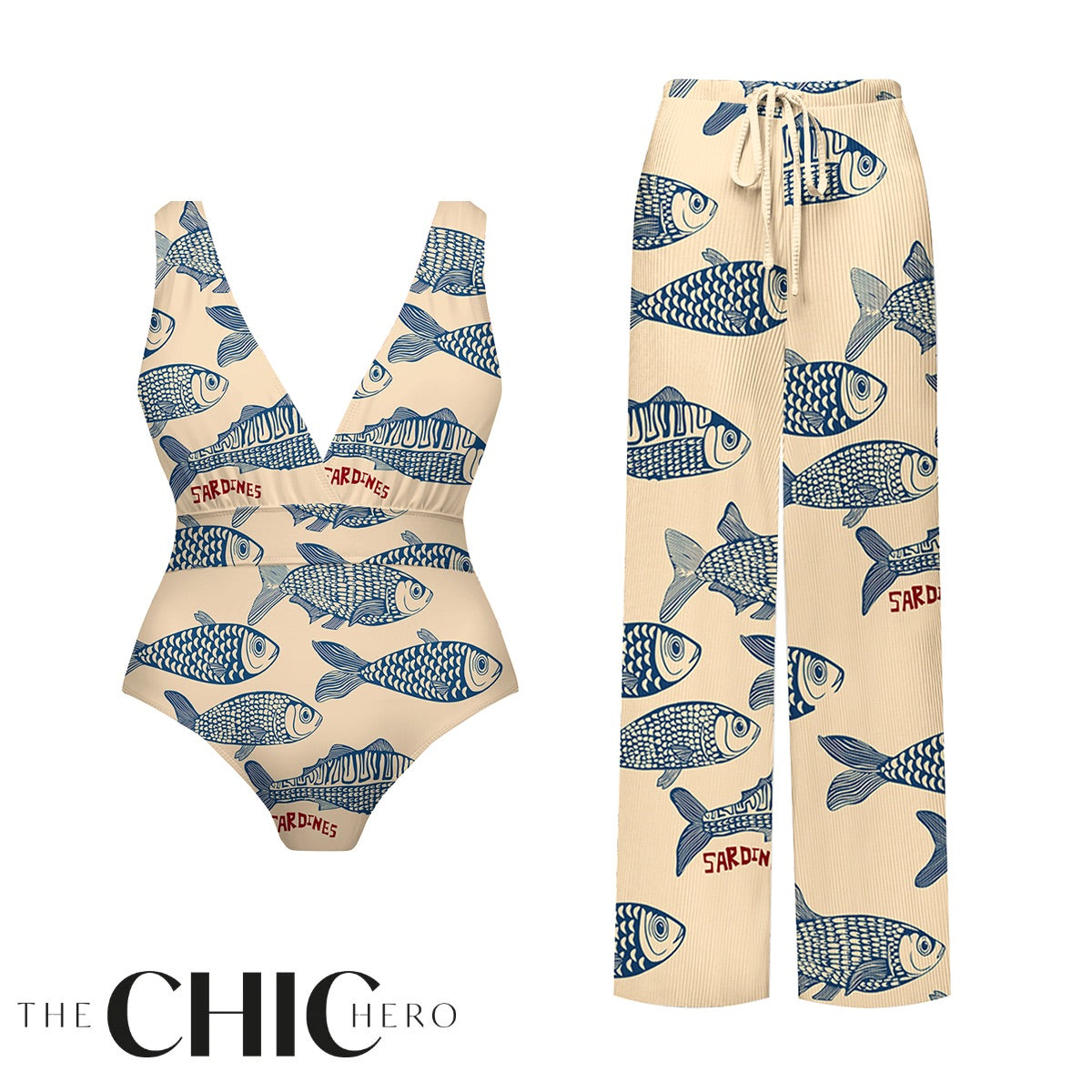 Nautical Sketch Sardine Print One-Piece Swimsuit&Pants