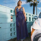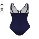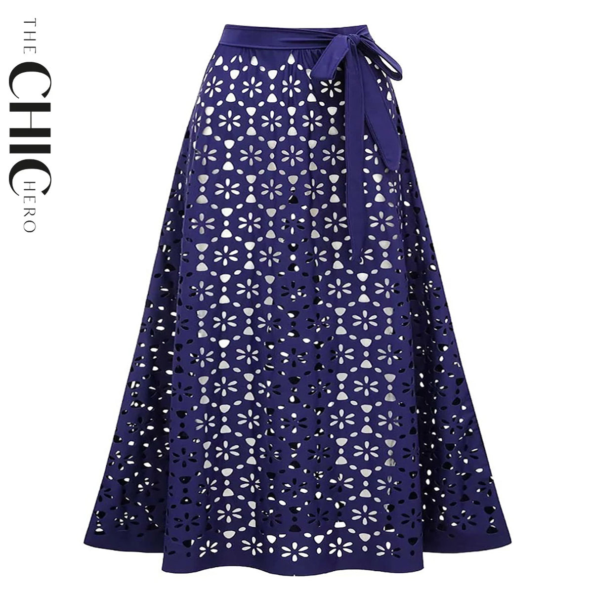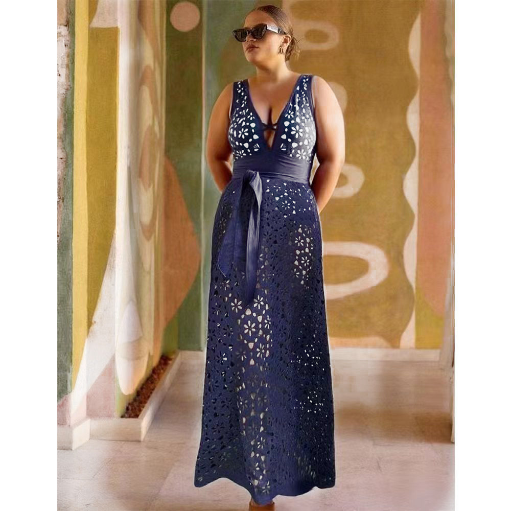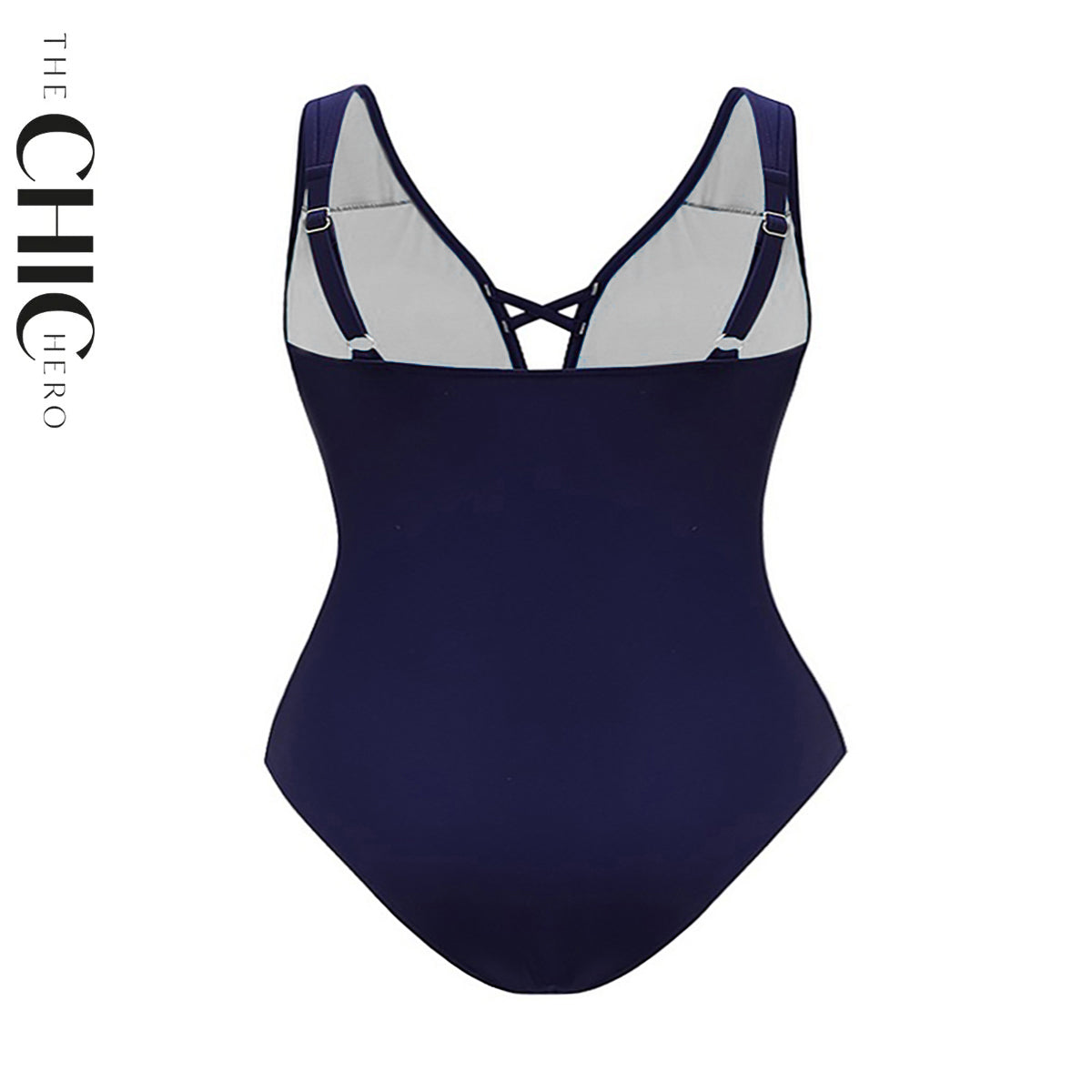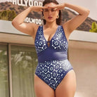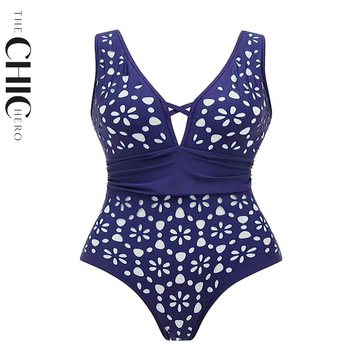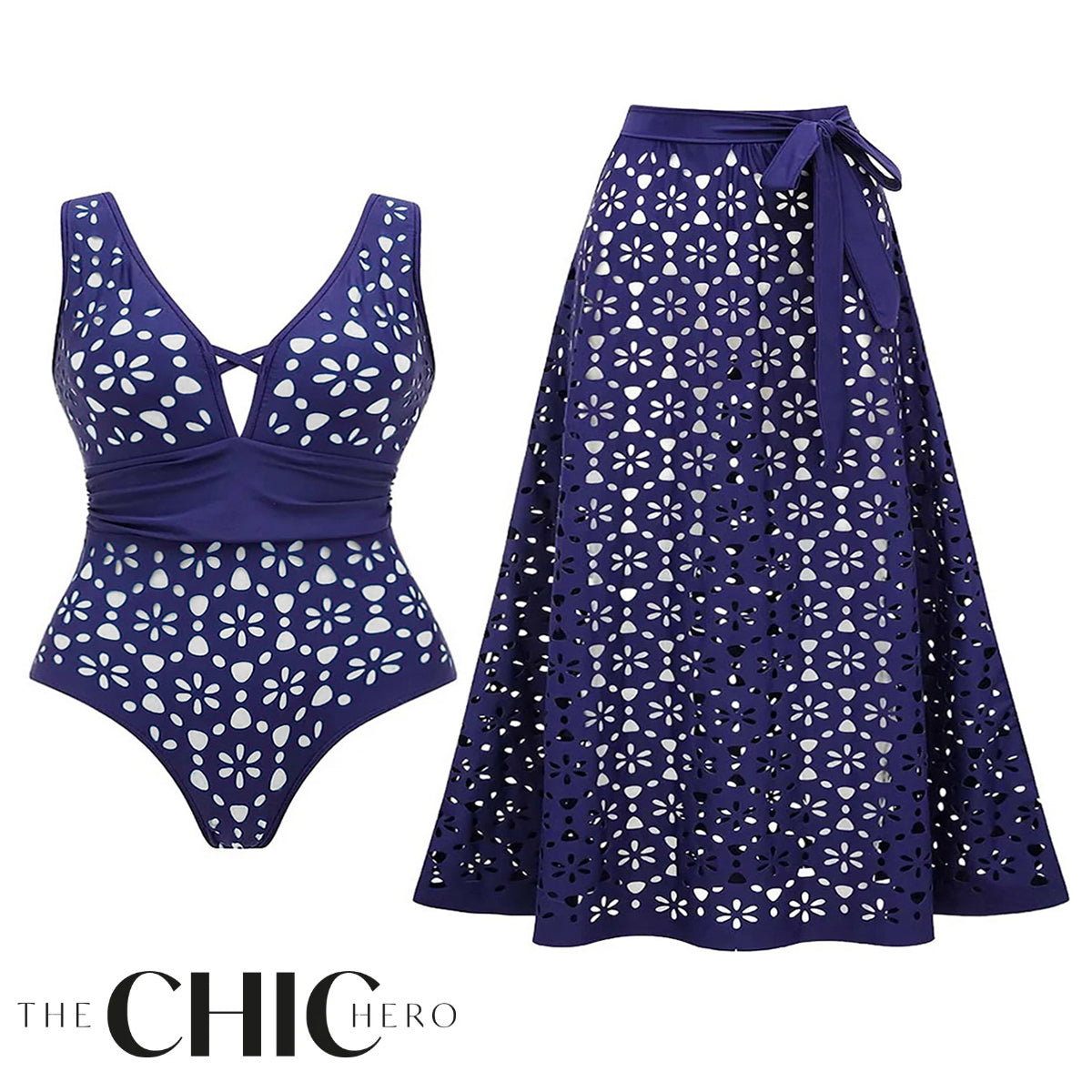 Navy Blue Petal Print Hollow One-Piece V Neck Swimsuit&Skirt