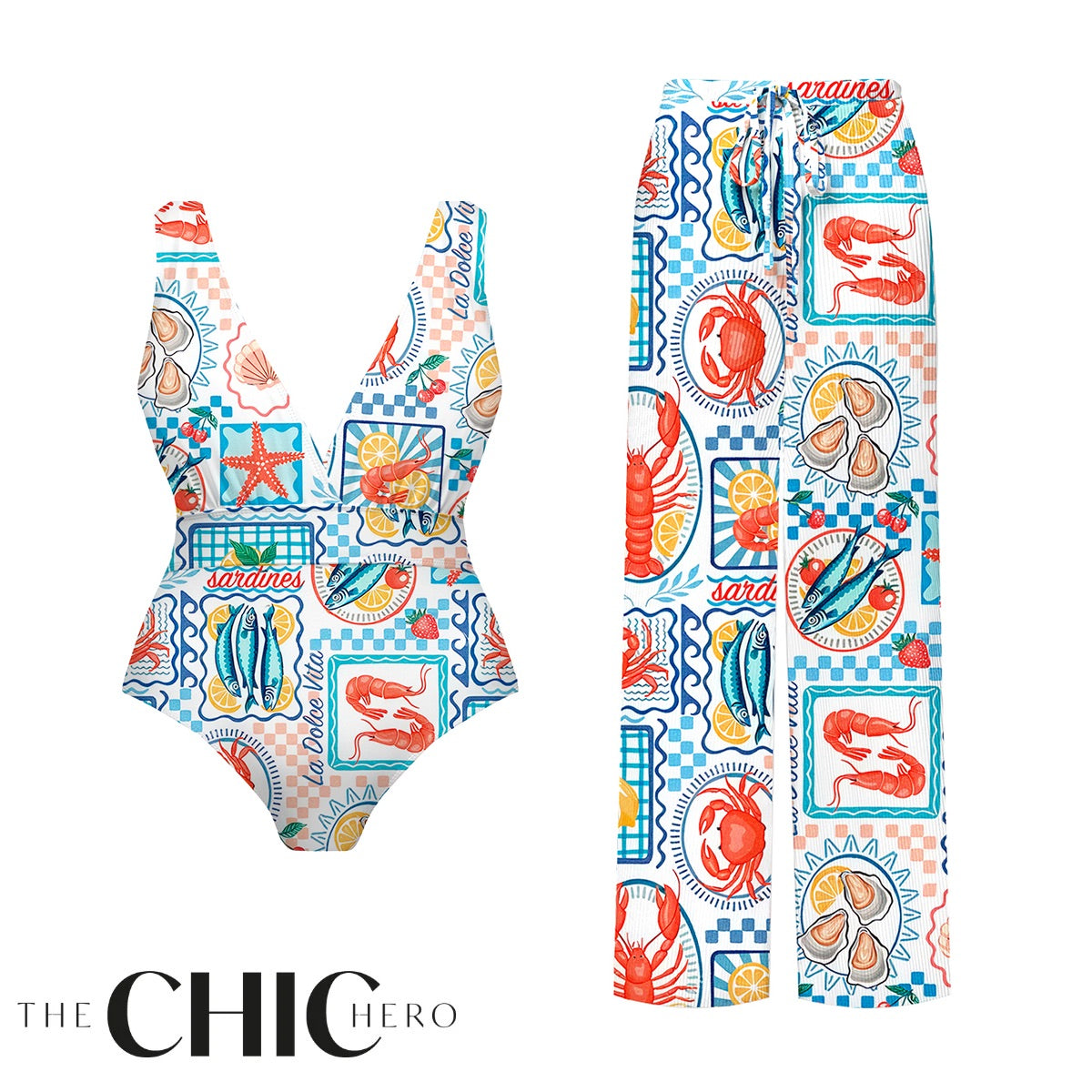 Ocean-Inspired Retro Sardine & Lobster One-Piece Swimsuit&Pants
