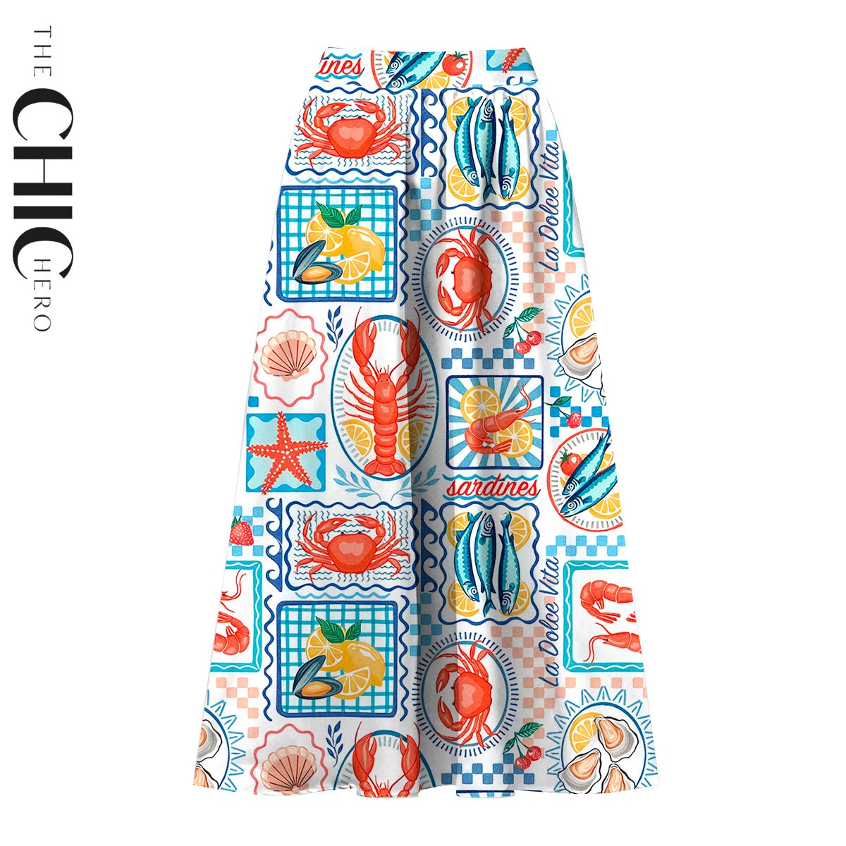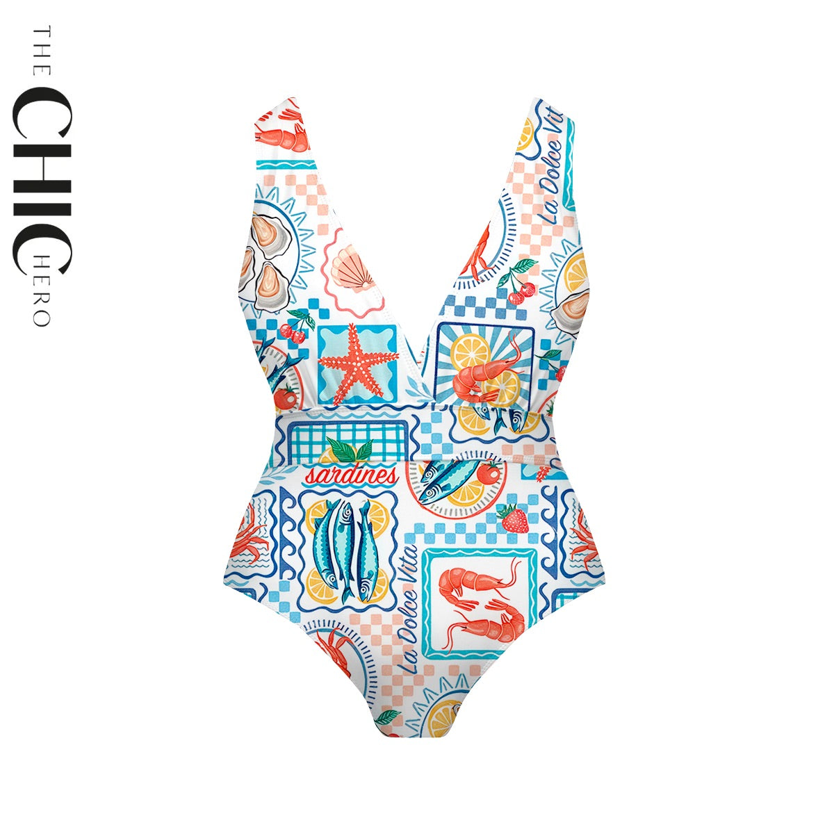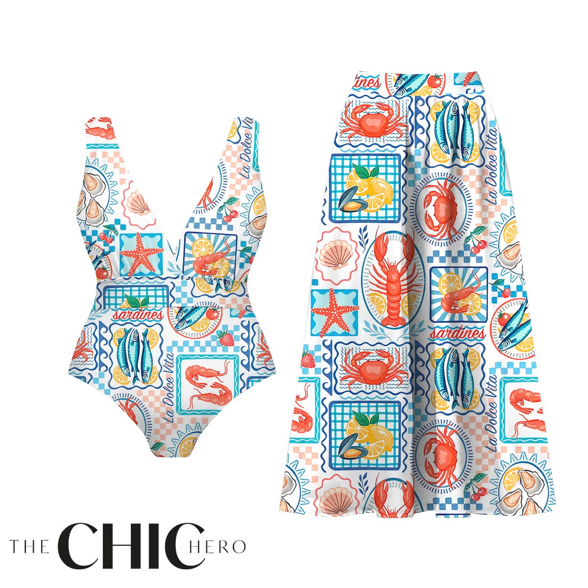Ocean-Inspired Retro Sardine & Lobster One-Piece Swimsuit&Skirt