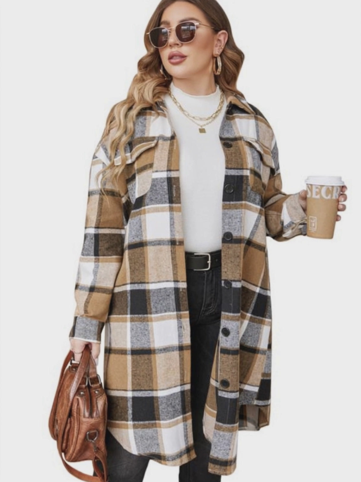 Classic fall check jacket shacket: retro and chic, long sleeve flannel shirt, long lightweight plaid jacket plus size for home, work, streetwear, holiday, office, travel, Christmas, daily, outdoor, party, dating, etc.