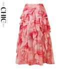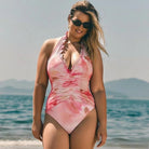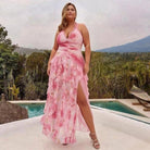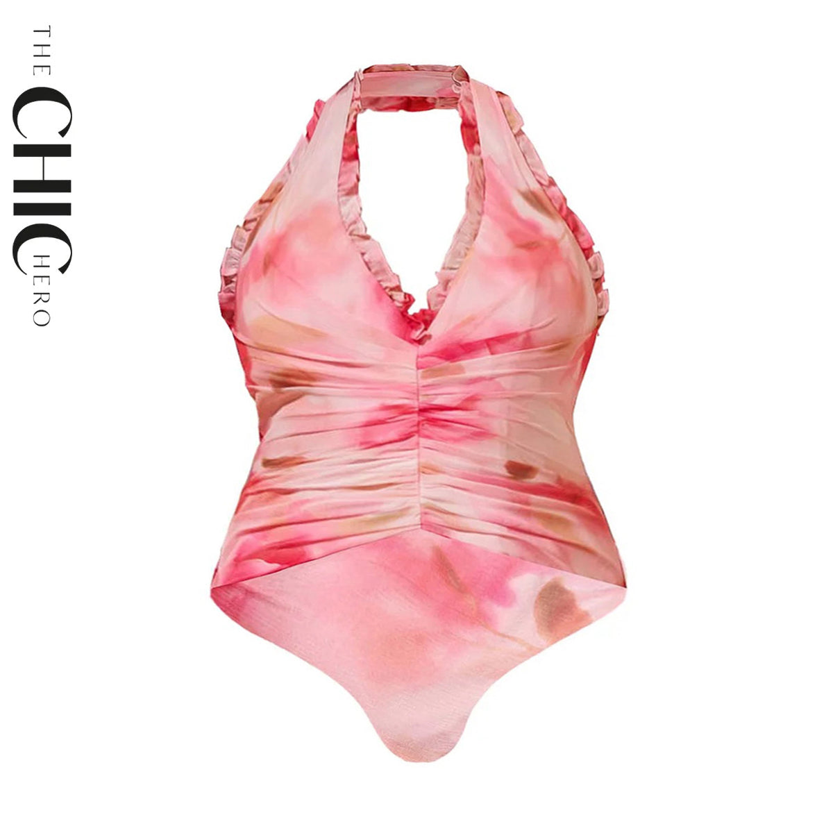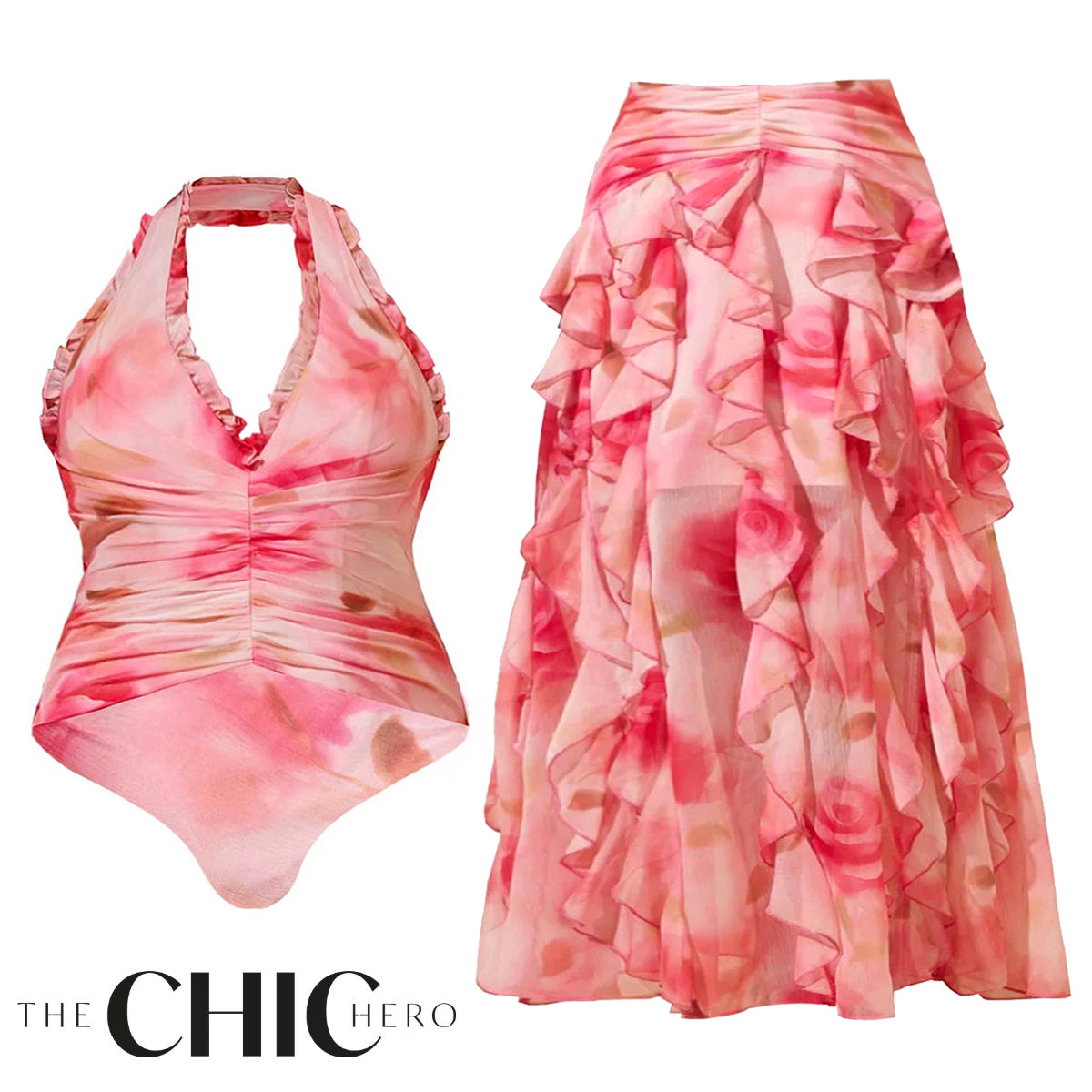 Romantic Pink Floral Halter Ruching One-Piece Swimsuit&Ruffled Skirt