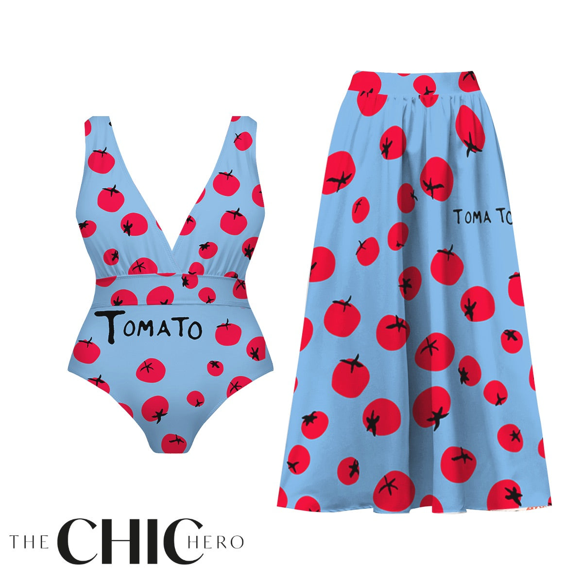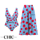 Sky Blue Fresh & Fun Tomato Print One-Piece Swimsuit&Skirt