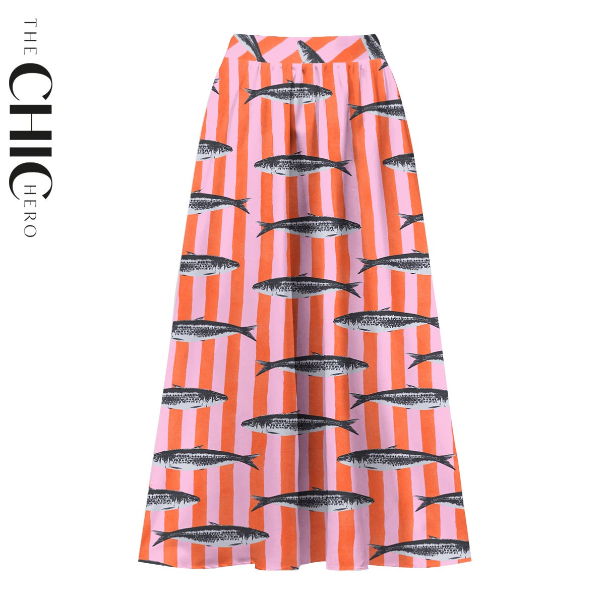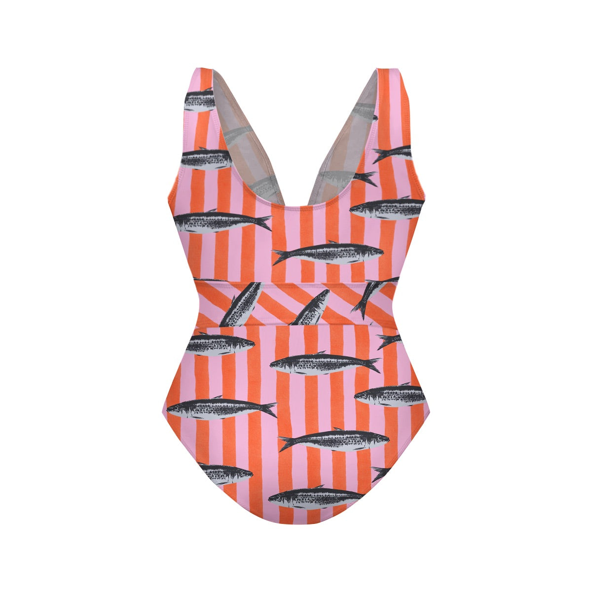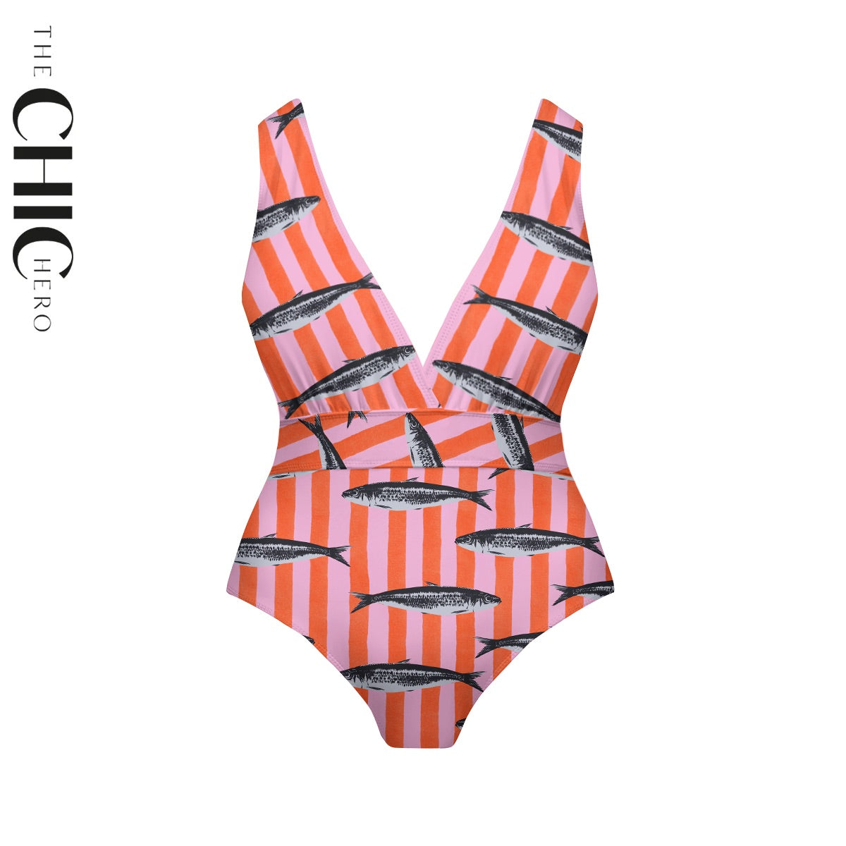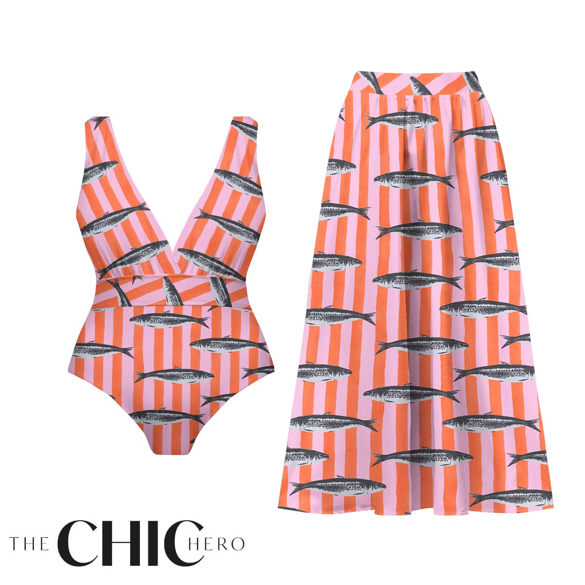 V Neck Retro Striped Sardine Print Swimsuit&Skirt