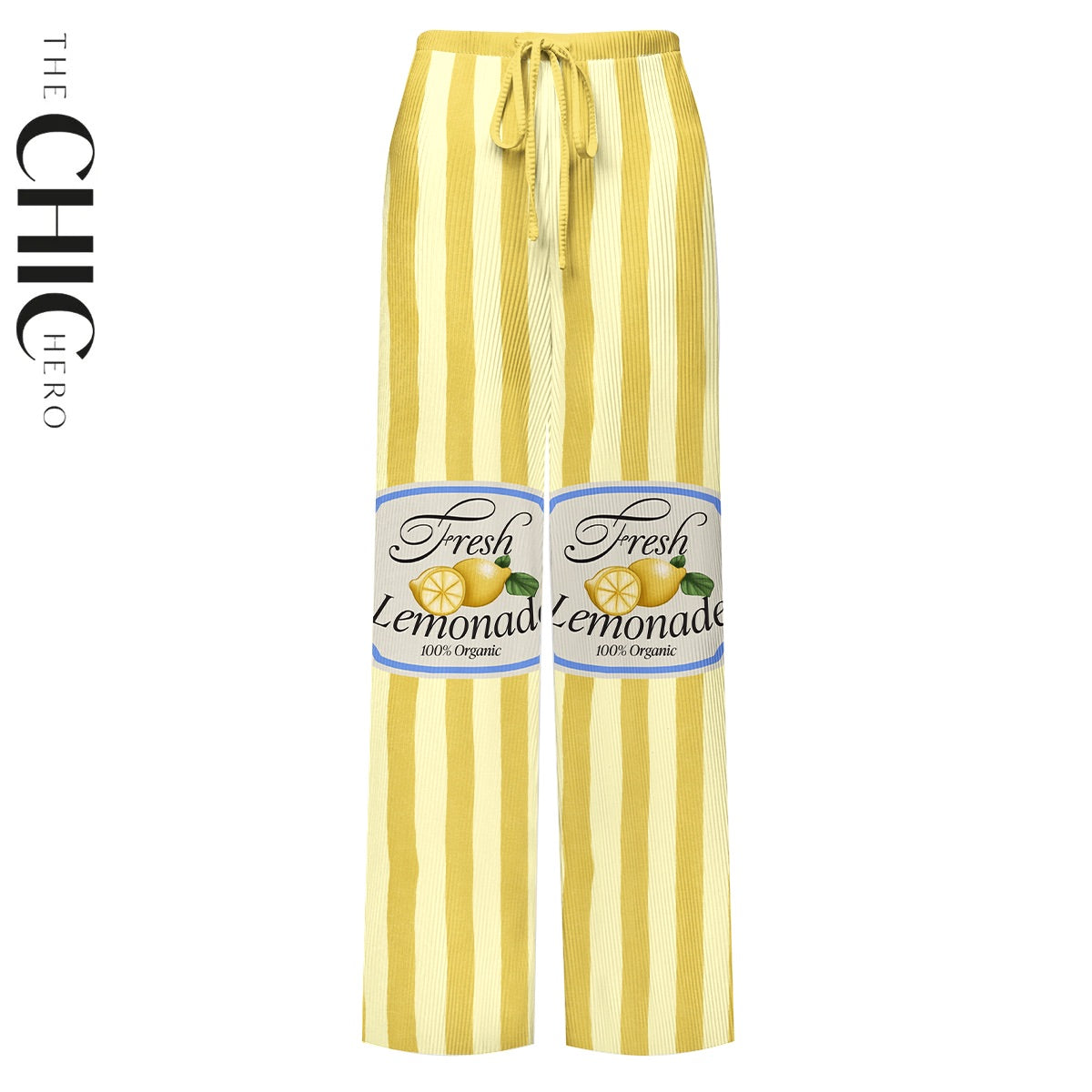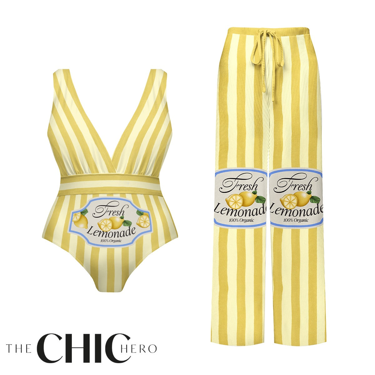 V Neck Retro Yellow Stripe Citrus Lemonade Print Swimsuit&Pants