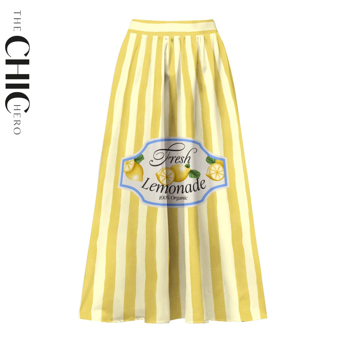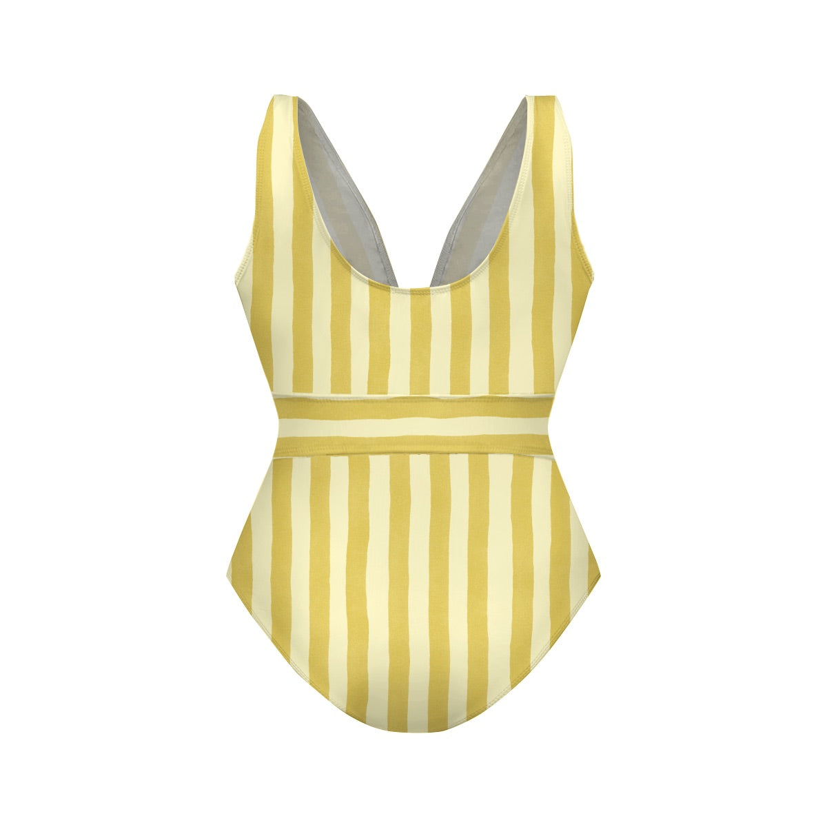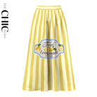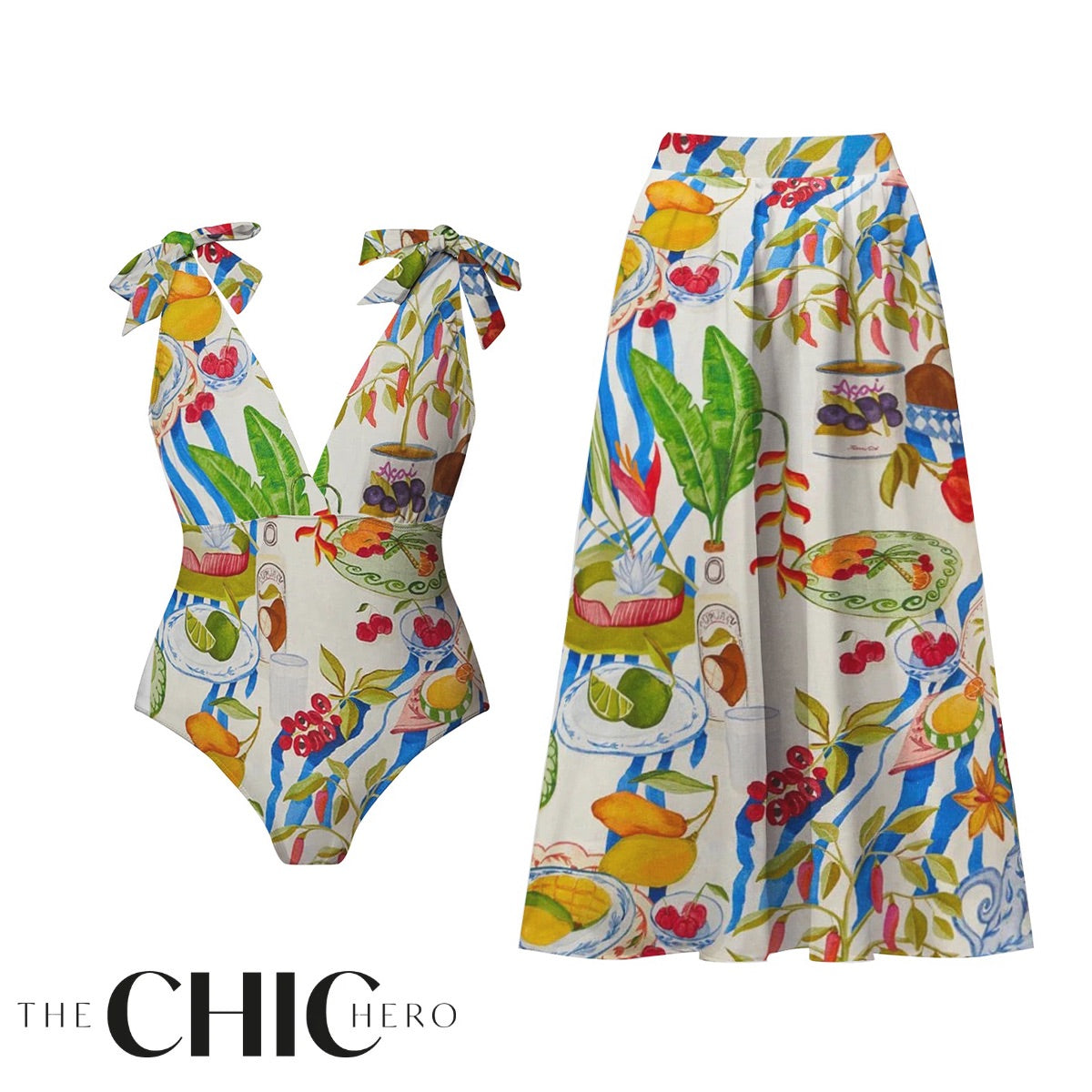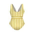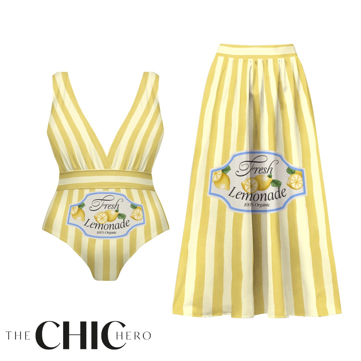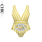 V Neck Retro Yellow Stripe Citrus Lemonade Print Swimsuit&Skirt