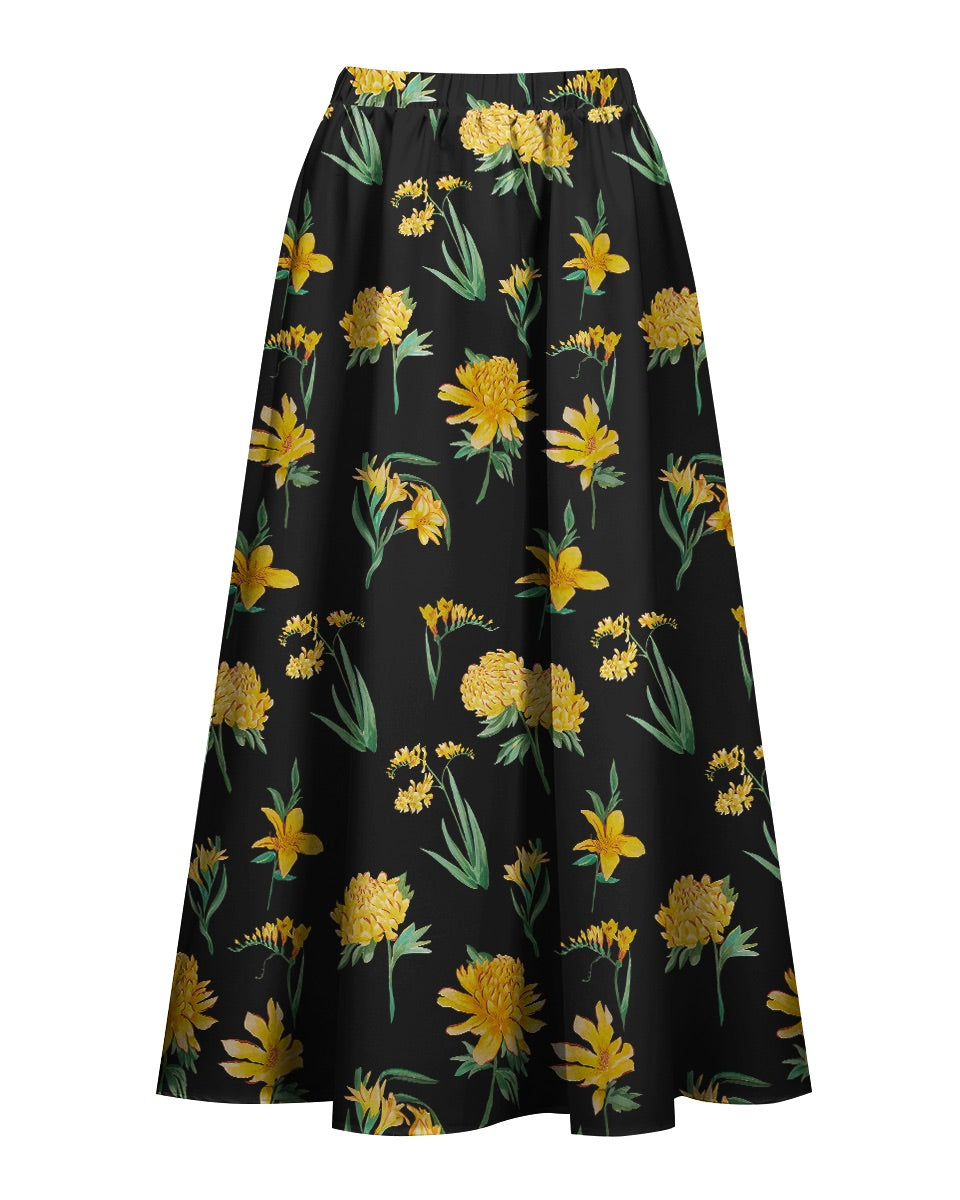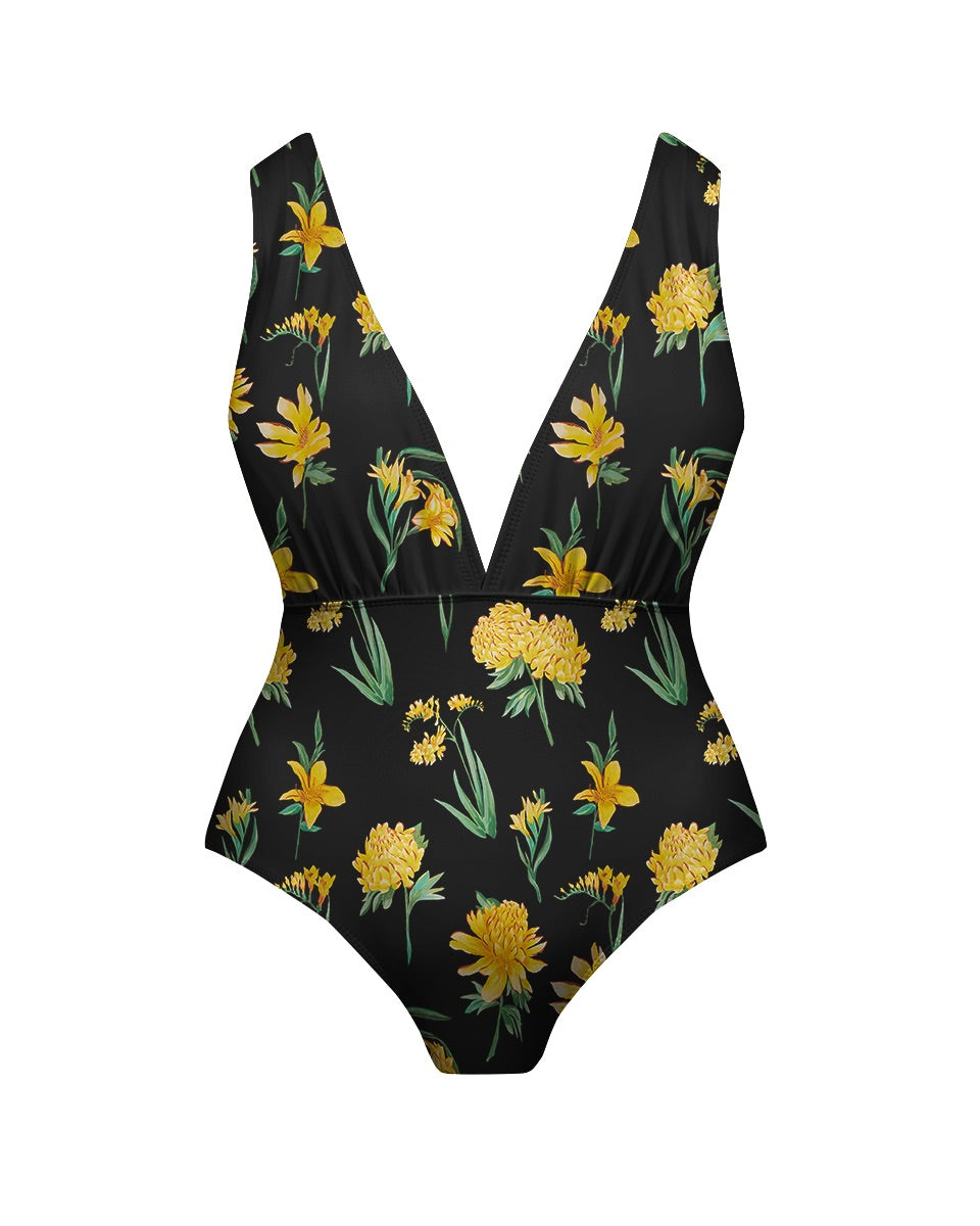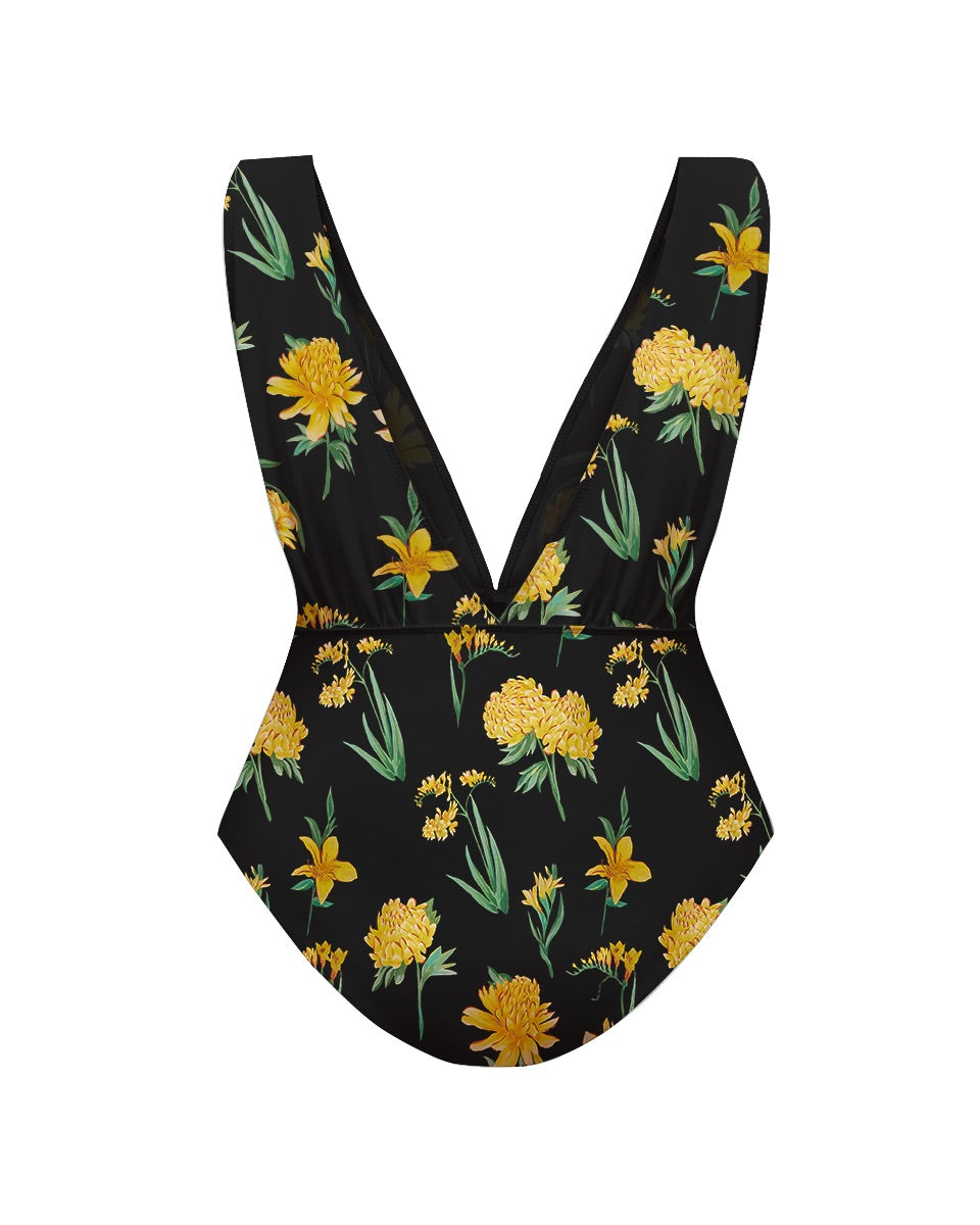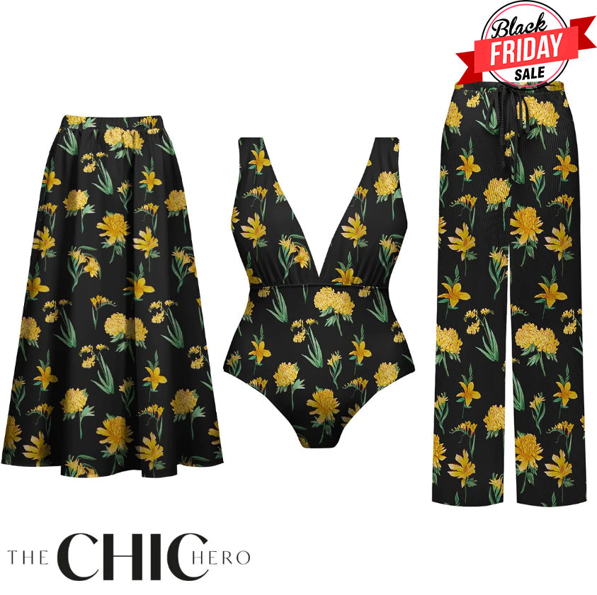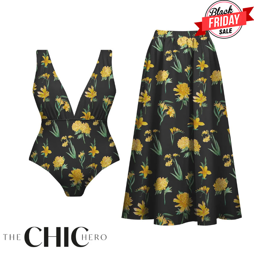 Yellow Floral Print One-Piece Swimsuit&Skirt