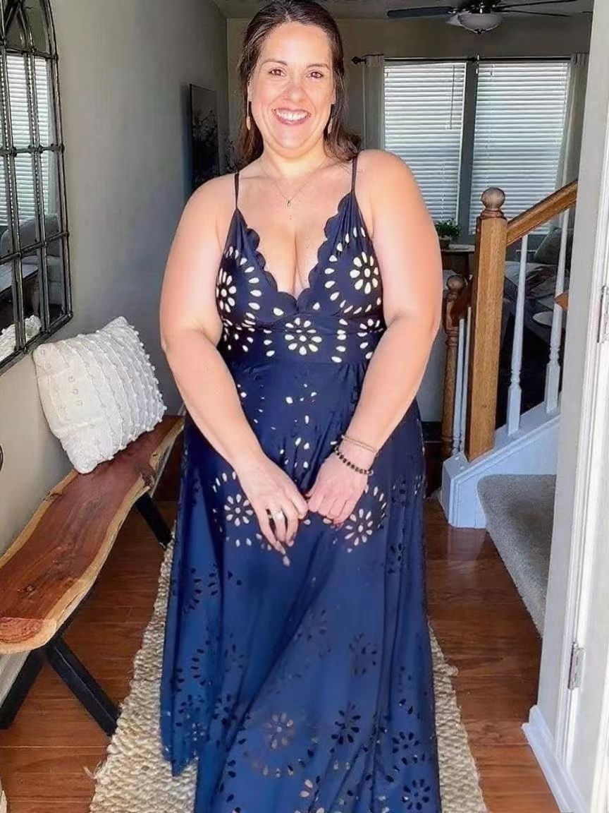 Navy Blue Petal Print Hollow One-Piece V Neck Swimsuit&Skirt
