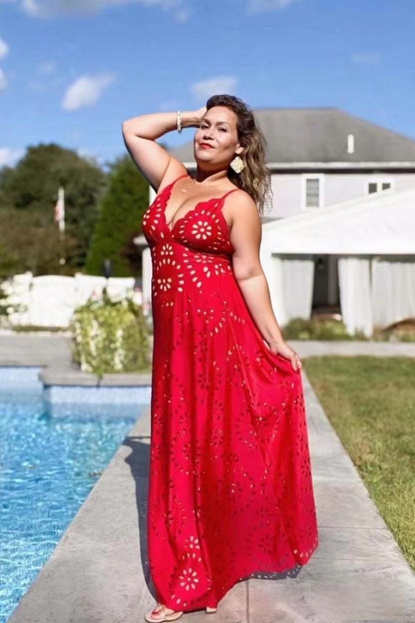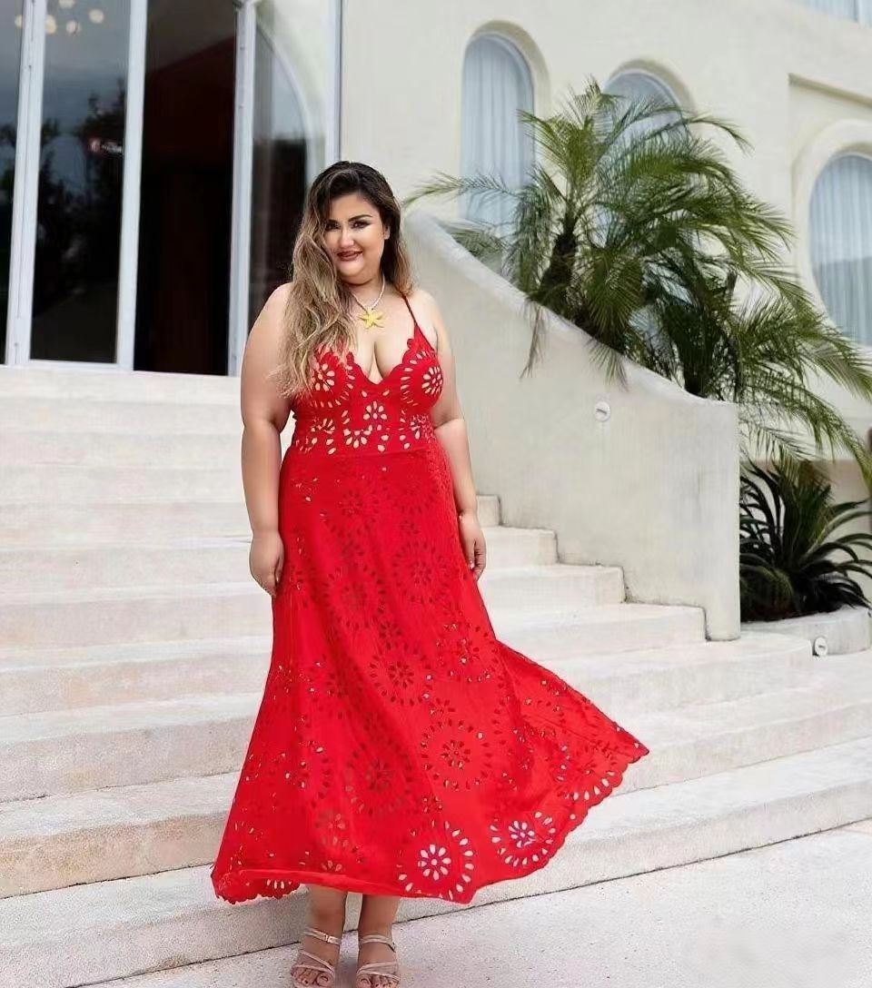 Red Scalloped Hollow Sexy One-Piece Swimsuit&Skirt