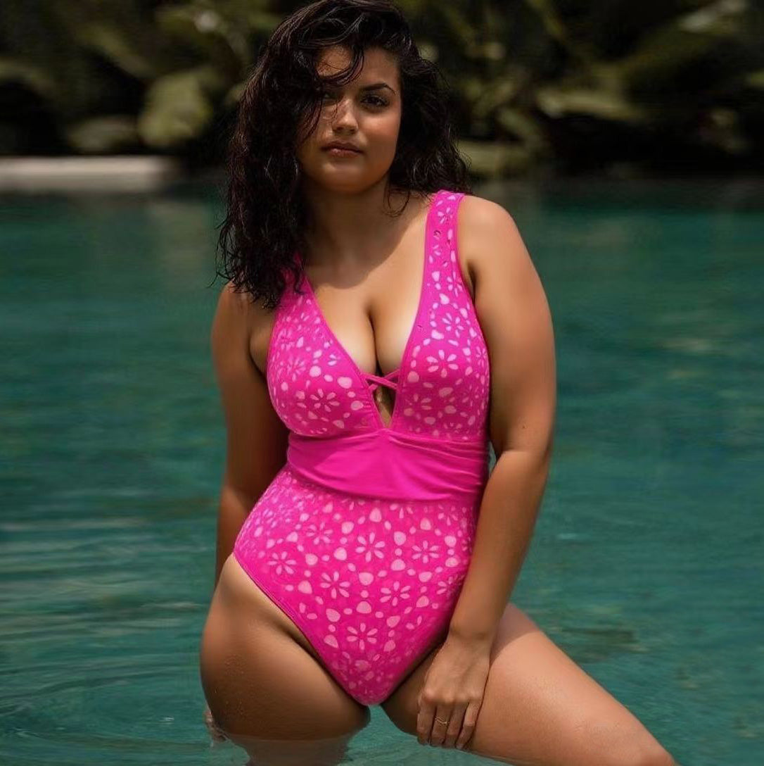 Rose Red Petal Print Hollow V Neck One-Piece Swimsuit&Skirt