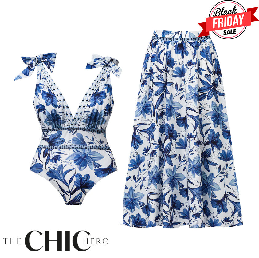 Chic Indigo Botanical Print One-Piece Swimsuit&Skirt