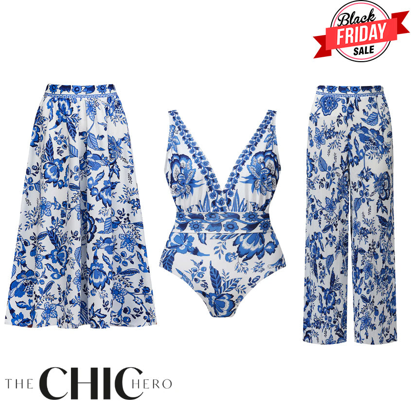 Chic Indigo Botanical Print One-Piece Swimsuit&Skirt&Pants