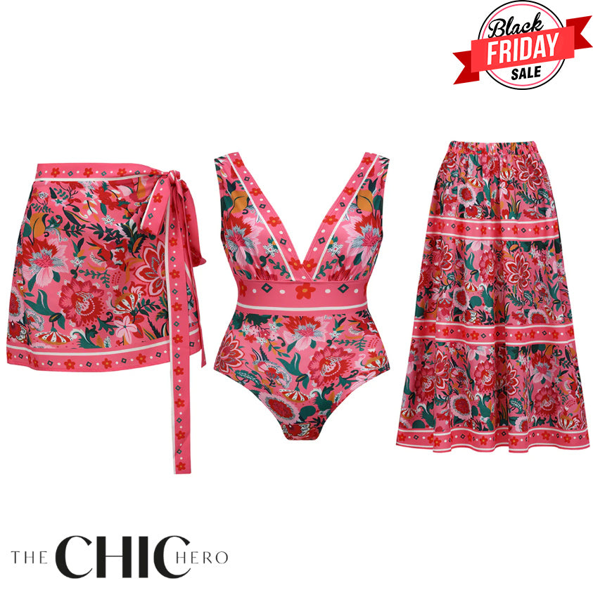 Pink Elegant Floral Patterns 3-Piece Set Swimsuit&Skirt