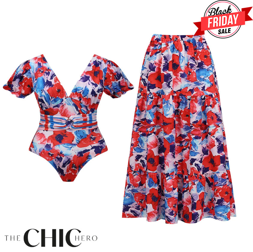 Colorful Floral Puff Sleeves One-Piece Swimsuit&Skirt