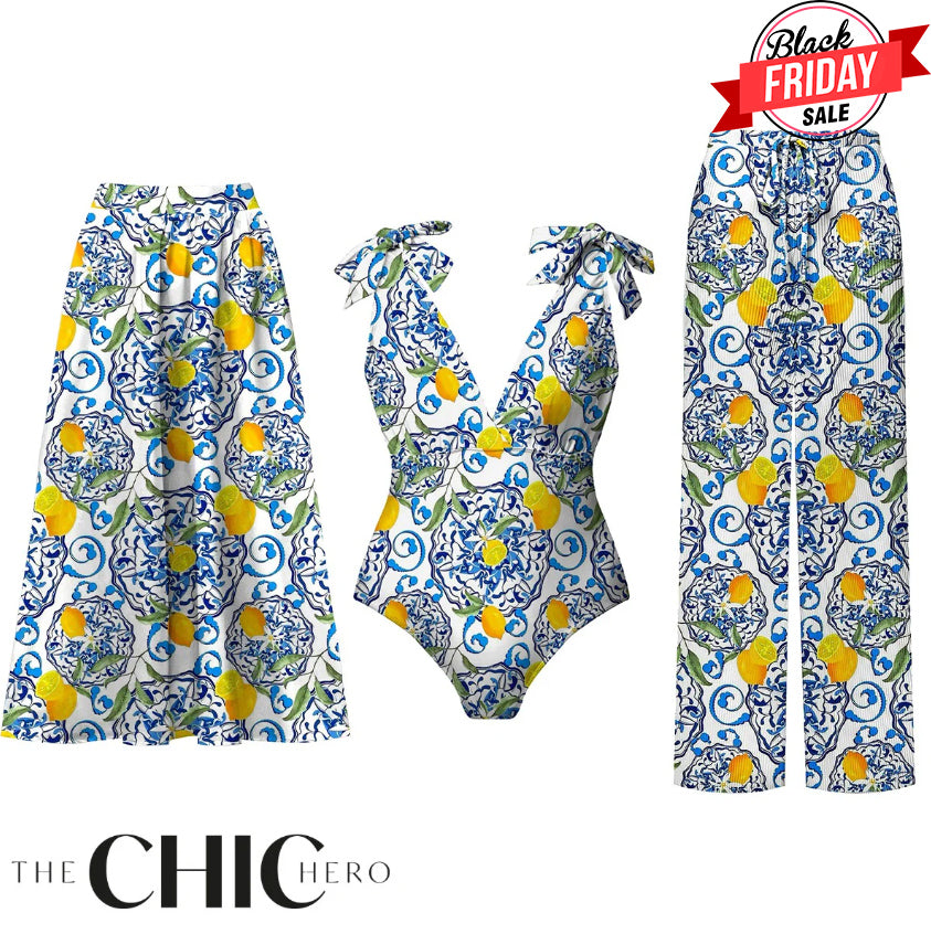 Lemon Blue Floral Print One-Piece Swimsuit&Skirt&Pants