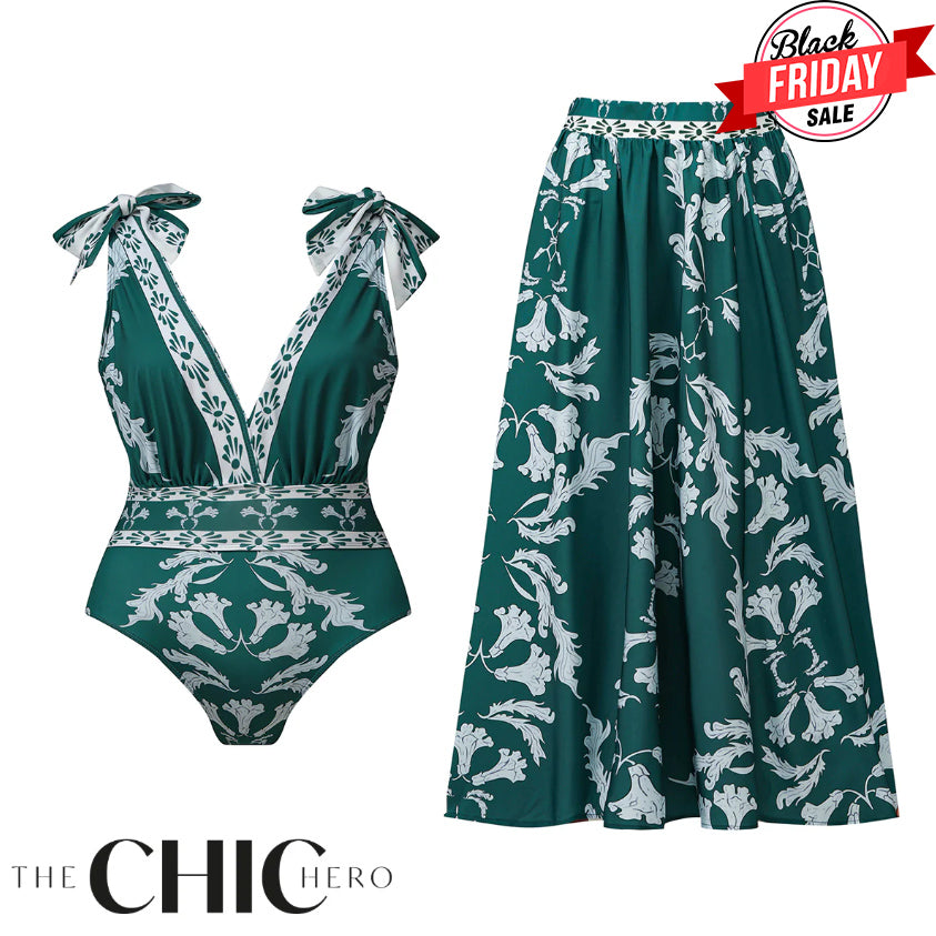 Green Flowy Floral Tie-shoulder Swimsuit&Skirt