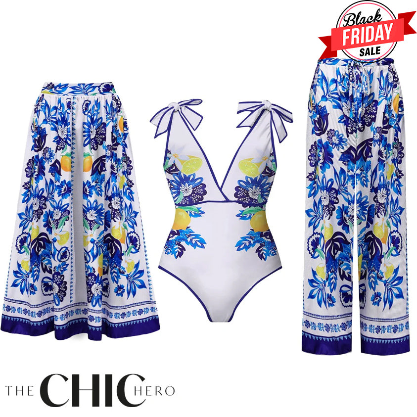 Lemon Blue Floral Print One-Piece Swimsuit&Skirt&Pants