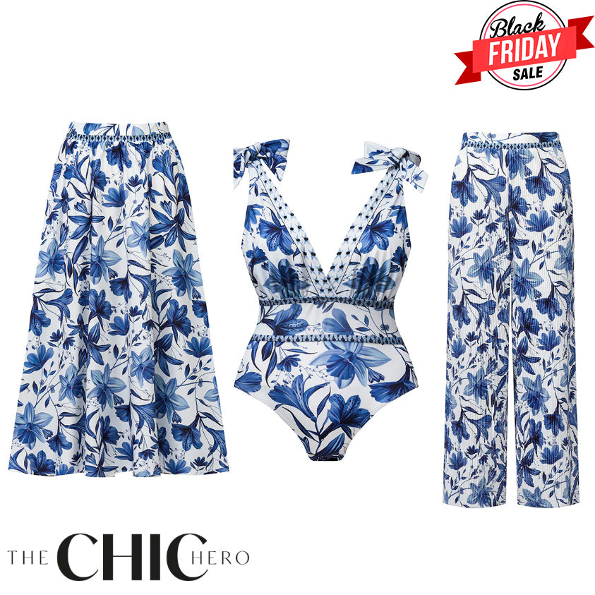 V Neck Lace Up Boho Breeze Blue Floral Swimsuit&Skirt&Pants