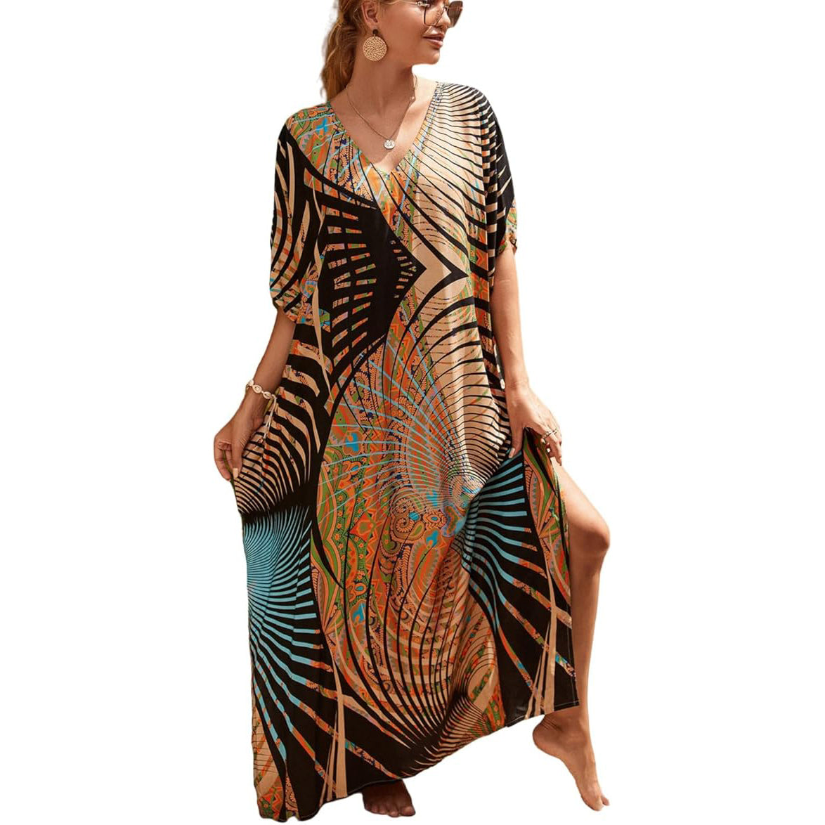 Abstract Geometric Colorful Illusion Pattern Maxi Kaftan Dress