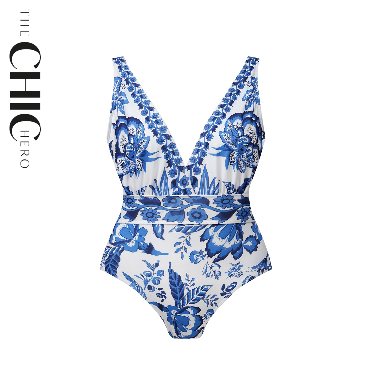 Chic Indigo Botanical Print One-Piece Swimsuit