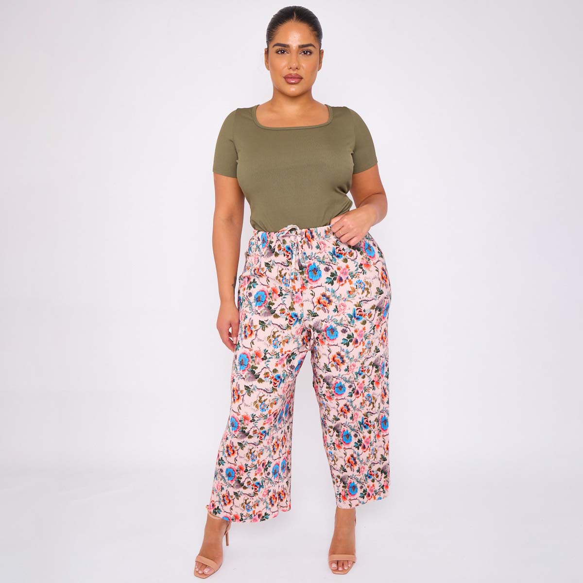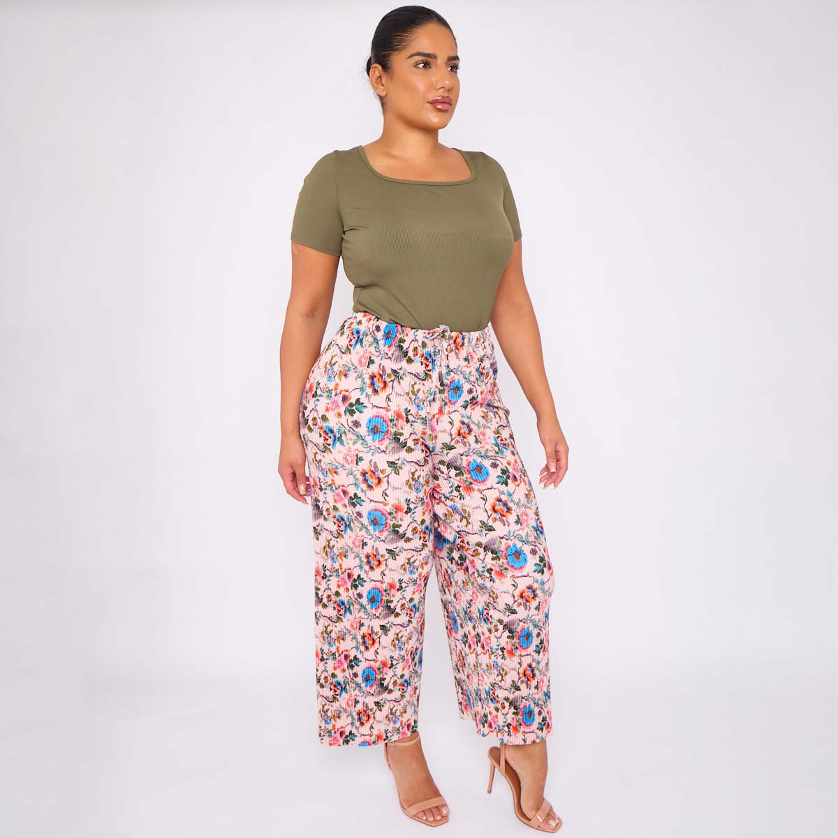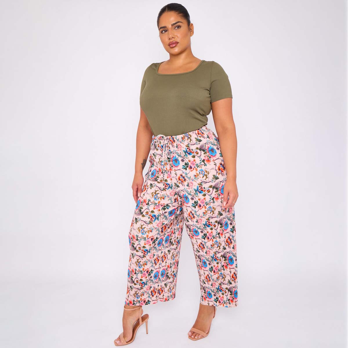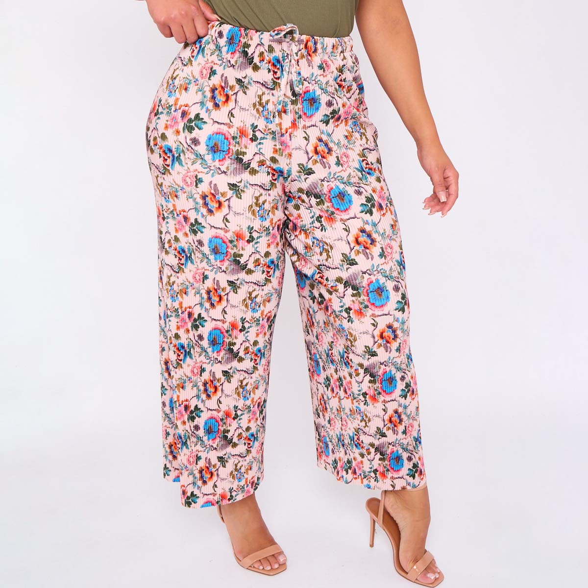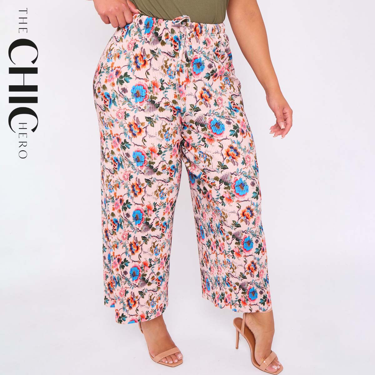 Colorful Florals Abstract Print Wide-Leg Drawstring Palazzo Pleated Pants