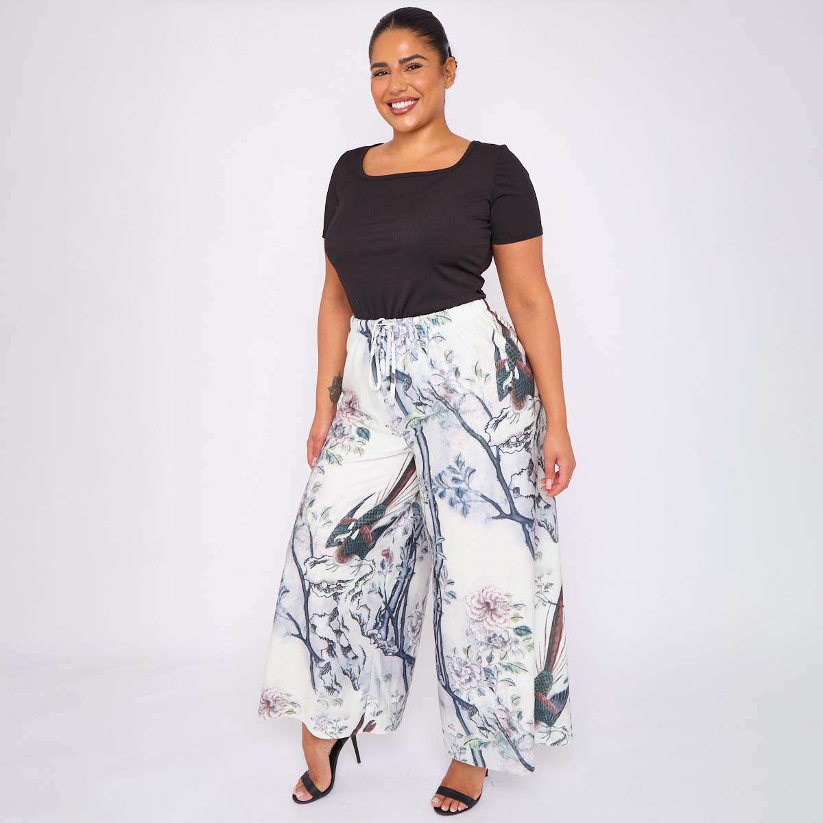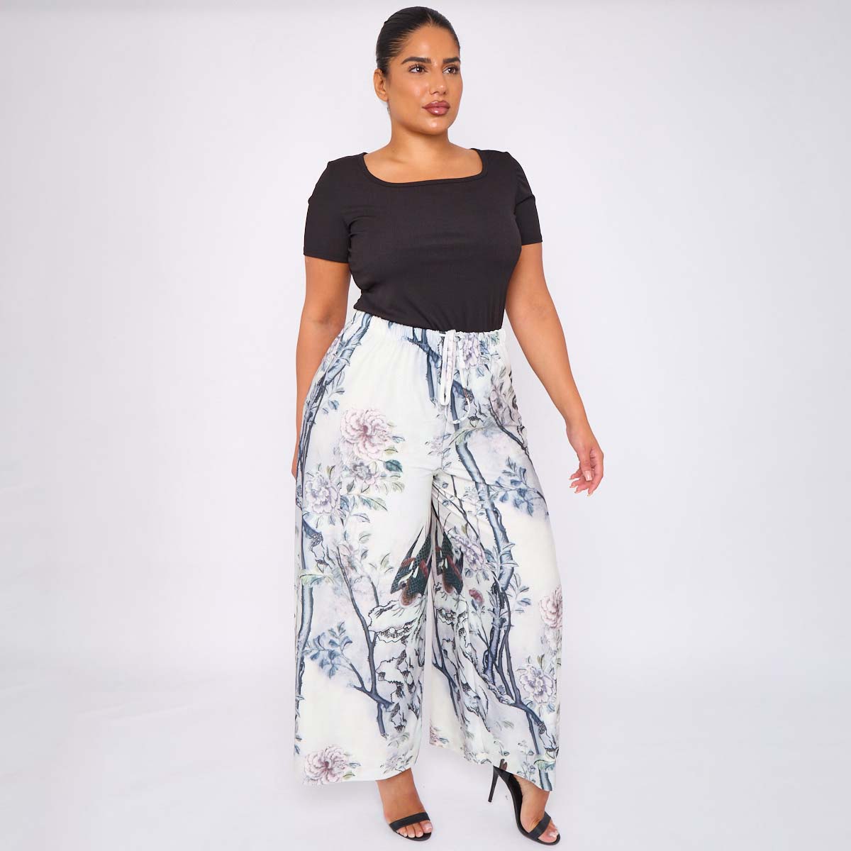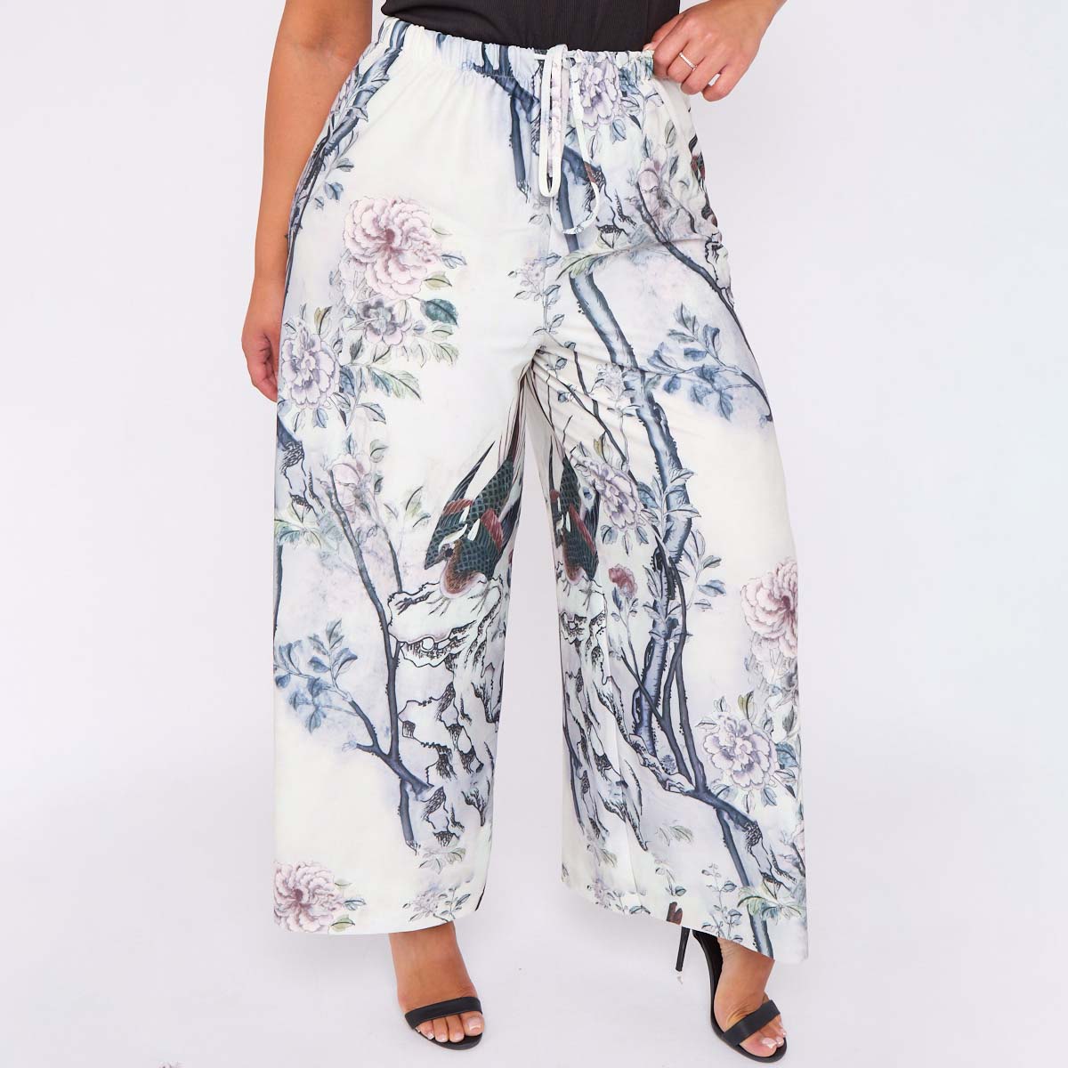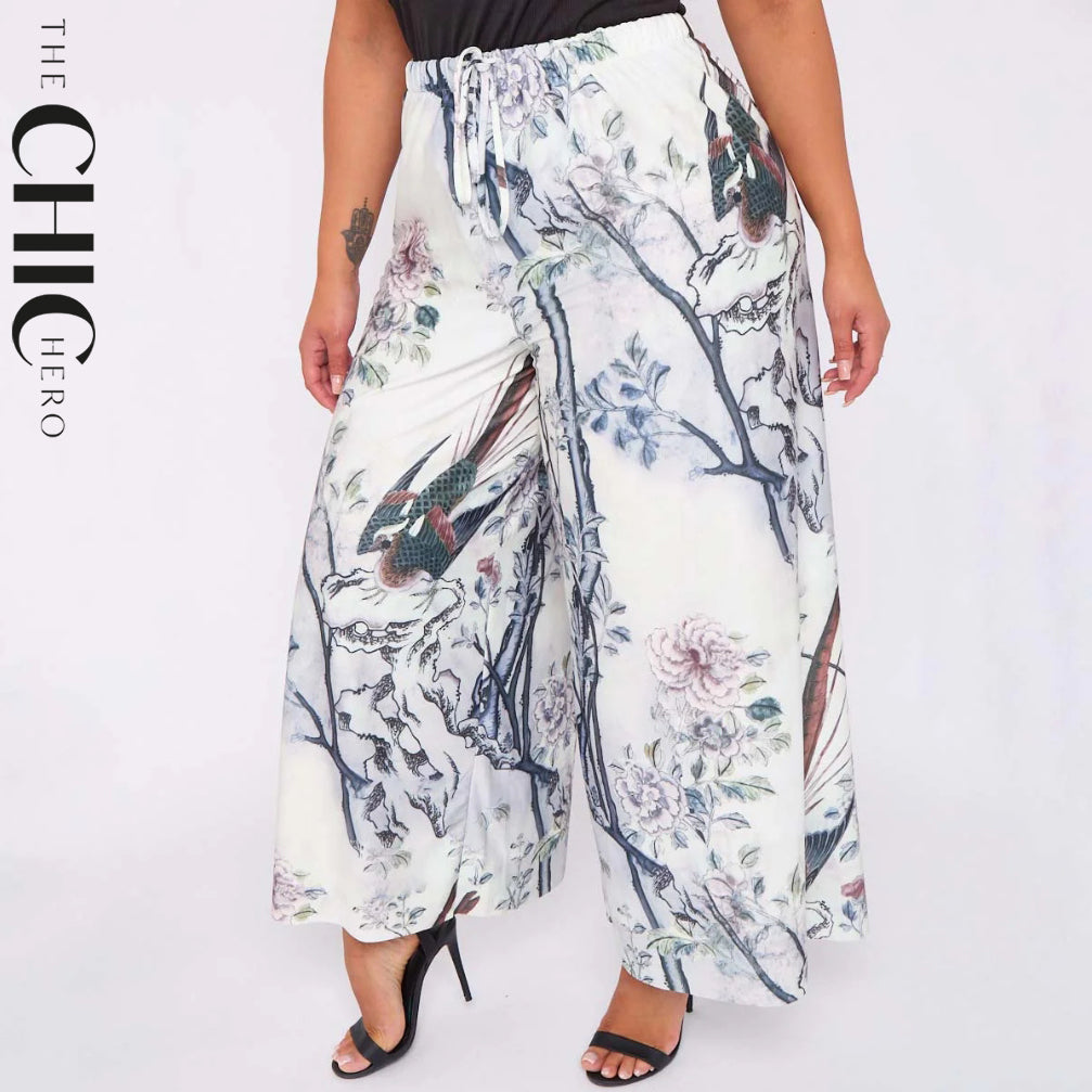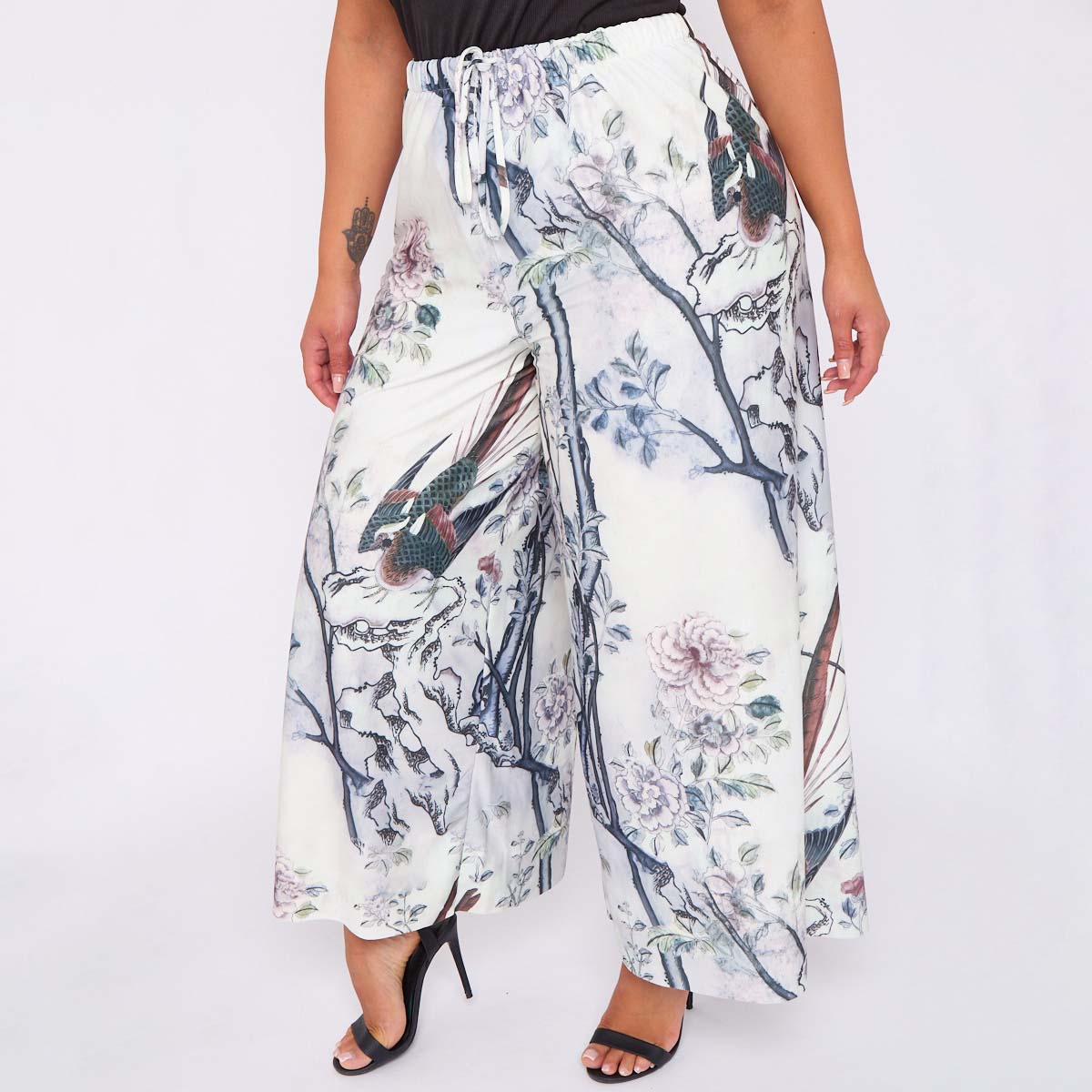 Bird Chinese style Abstract Print Wide-Leg Drawstring Pants Palazzo Pleated Pants