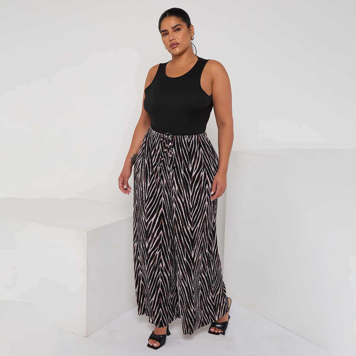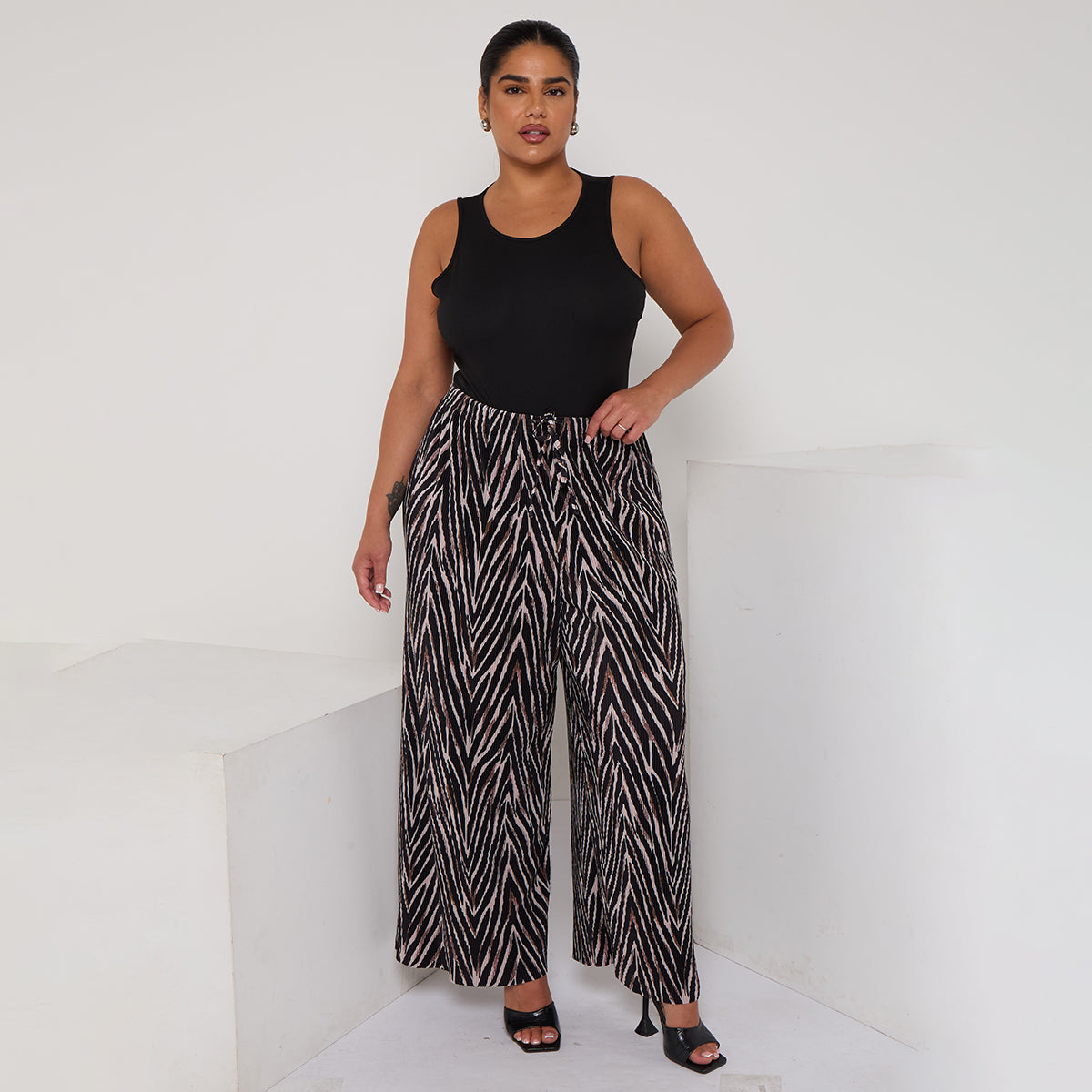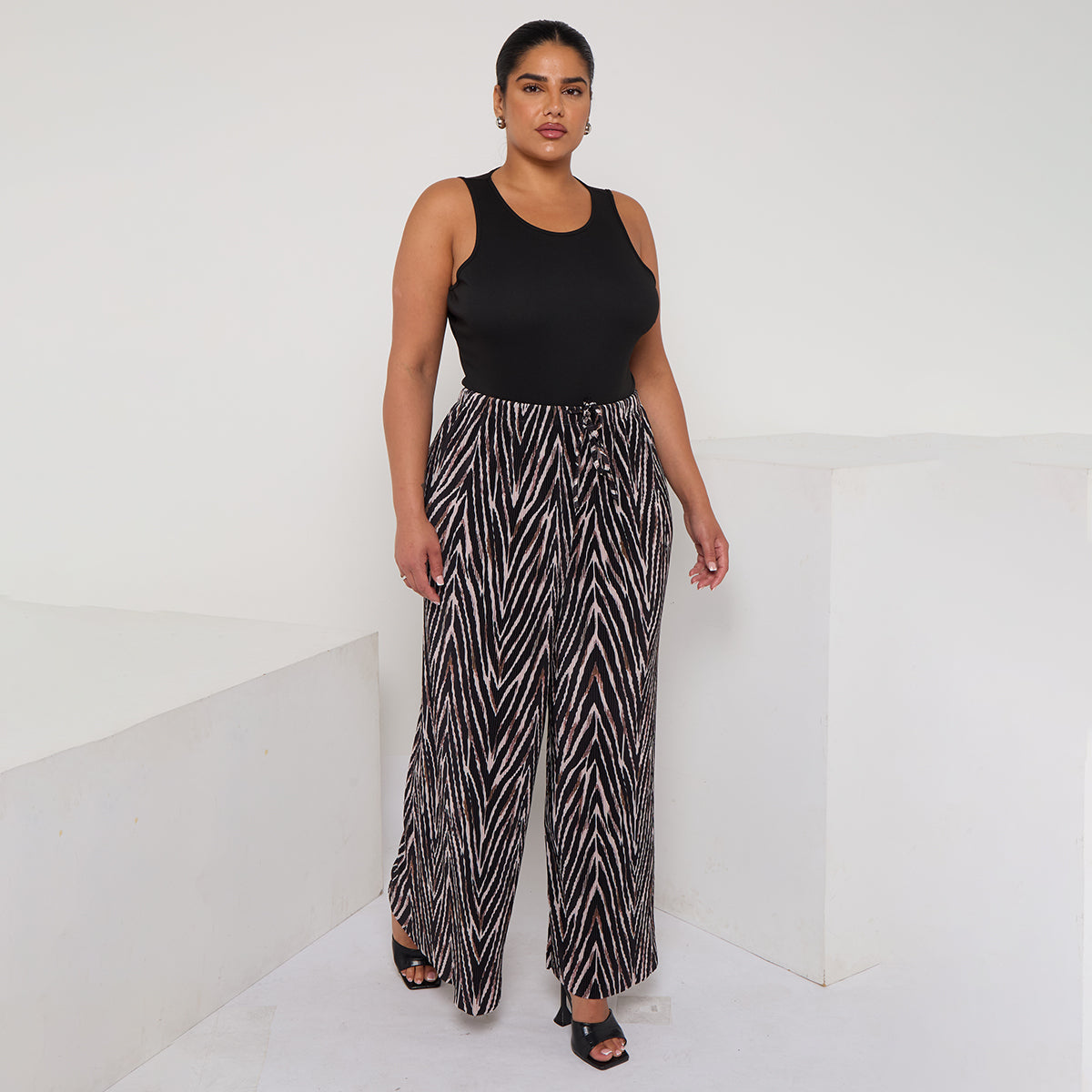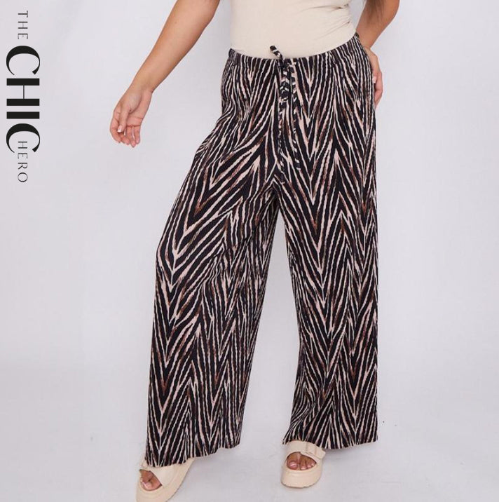 Brown Zebra Abstract Print Wide-Leg Drawstring Palazzo Pleated Pants