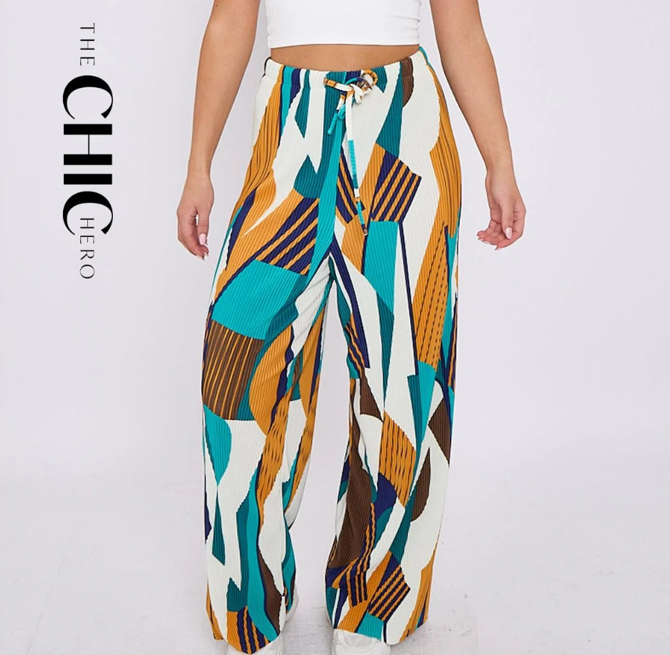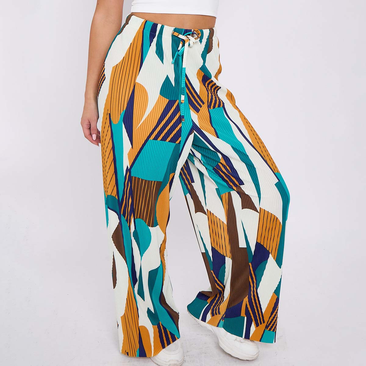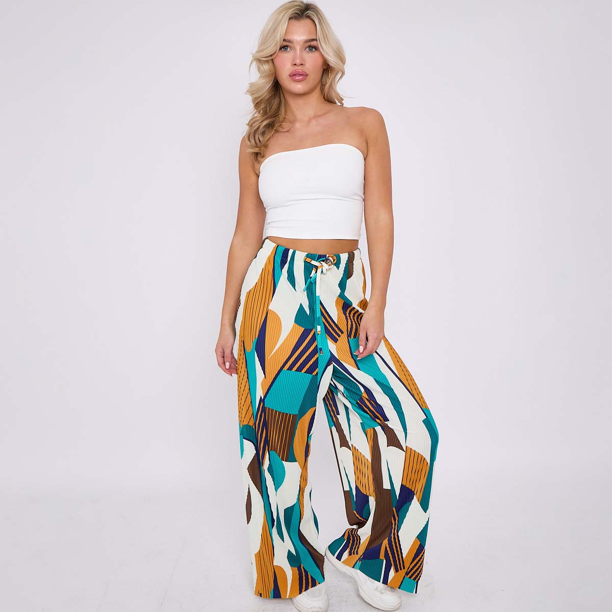 Geometric Patterns Geo Abstract Print Wide-Leg Drawstring Palazzo Pleated Pants