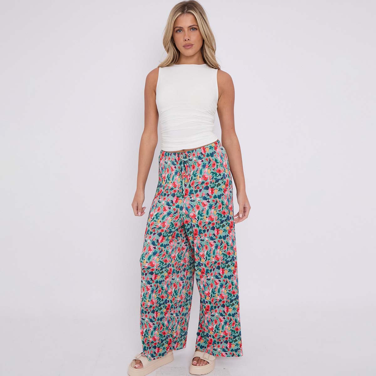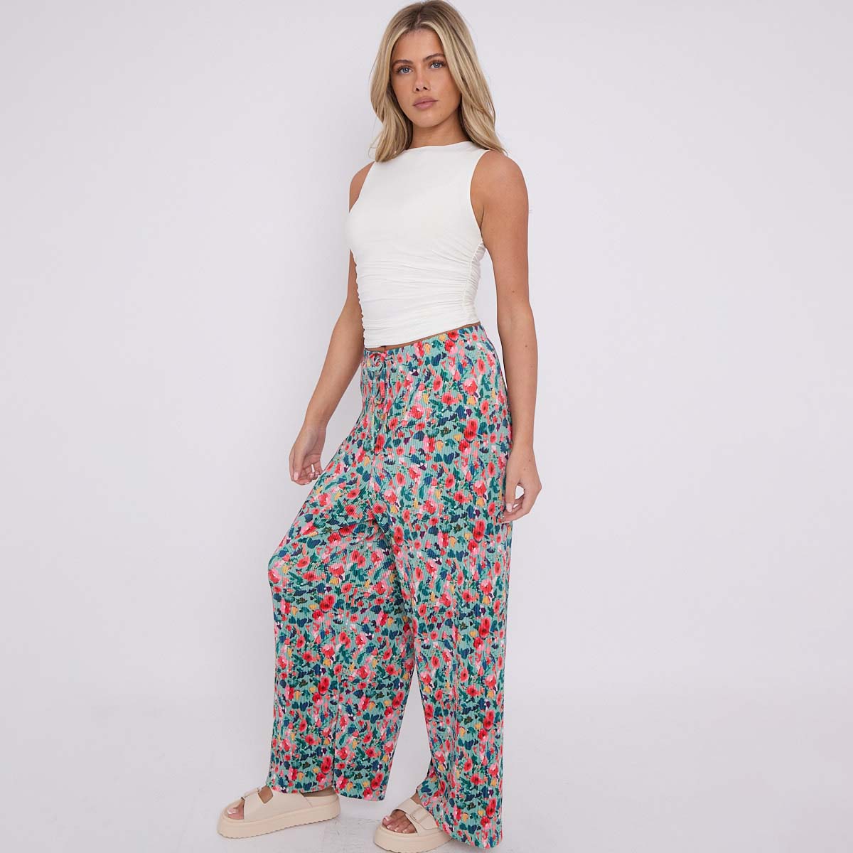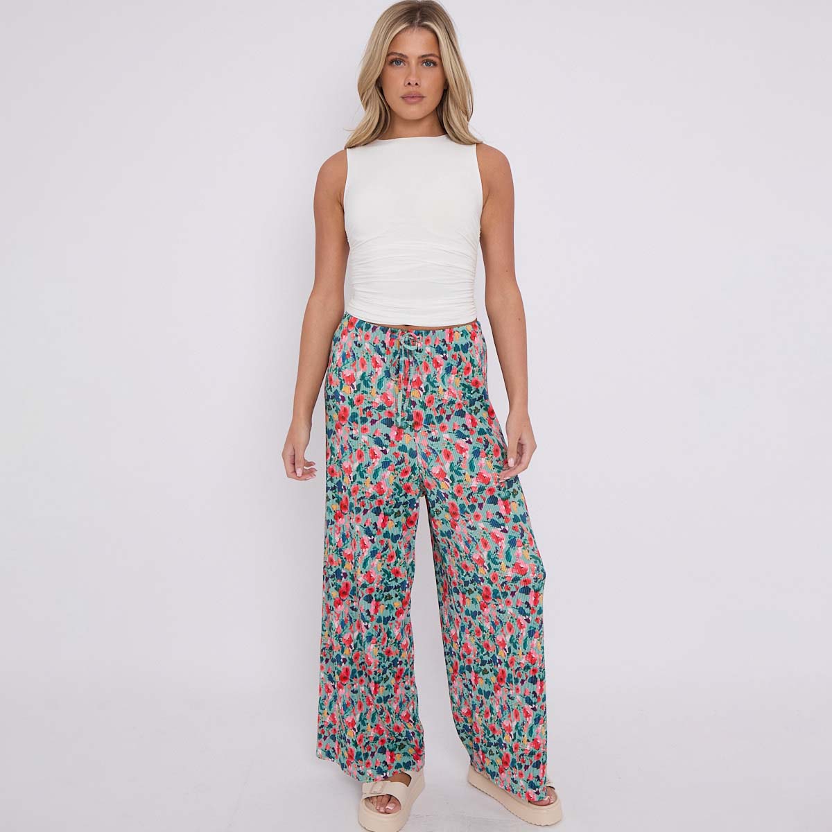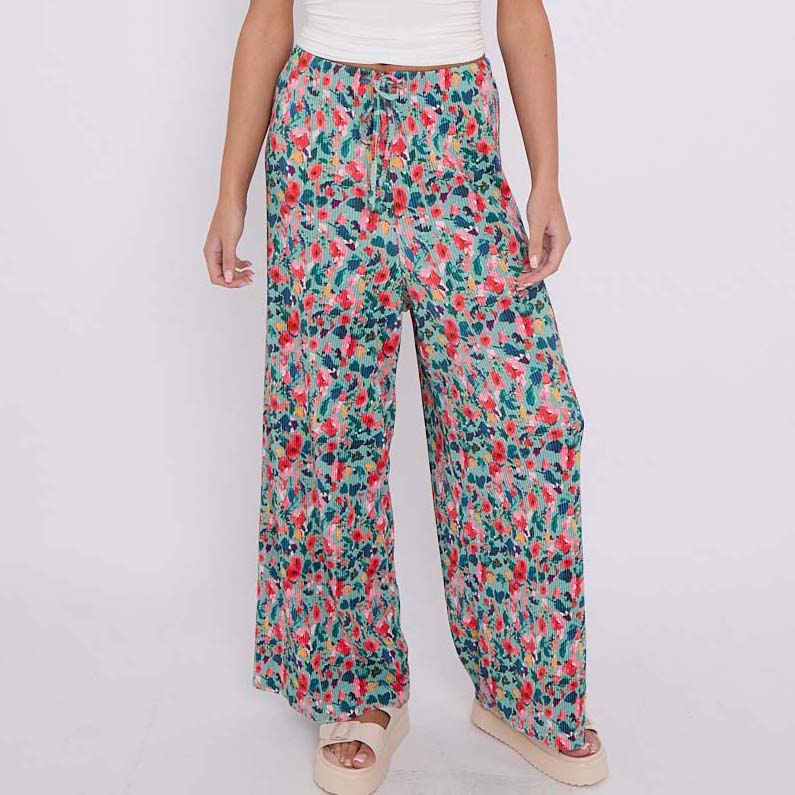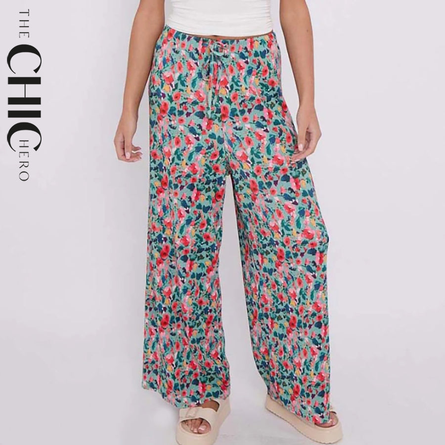 Small Florals Abstract Wide-Leg Drawstring Palazzo Pleated Pants