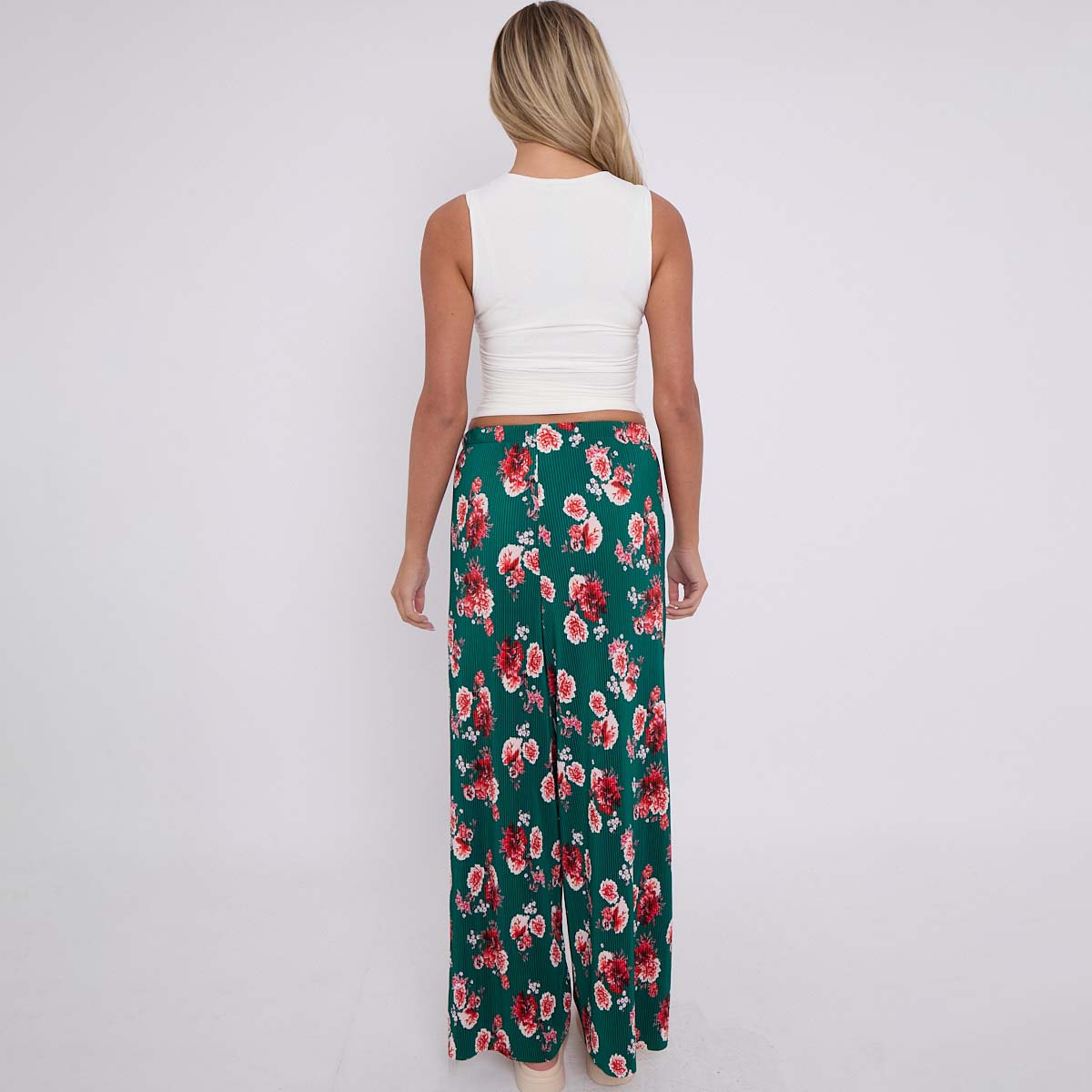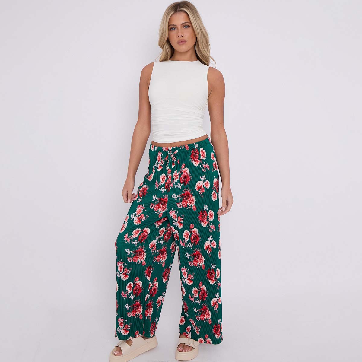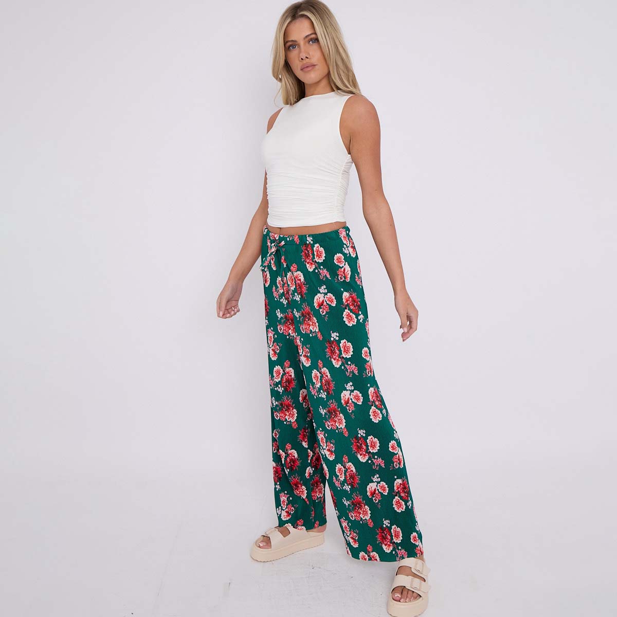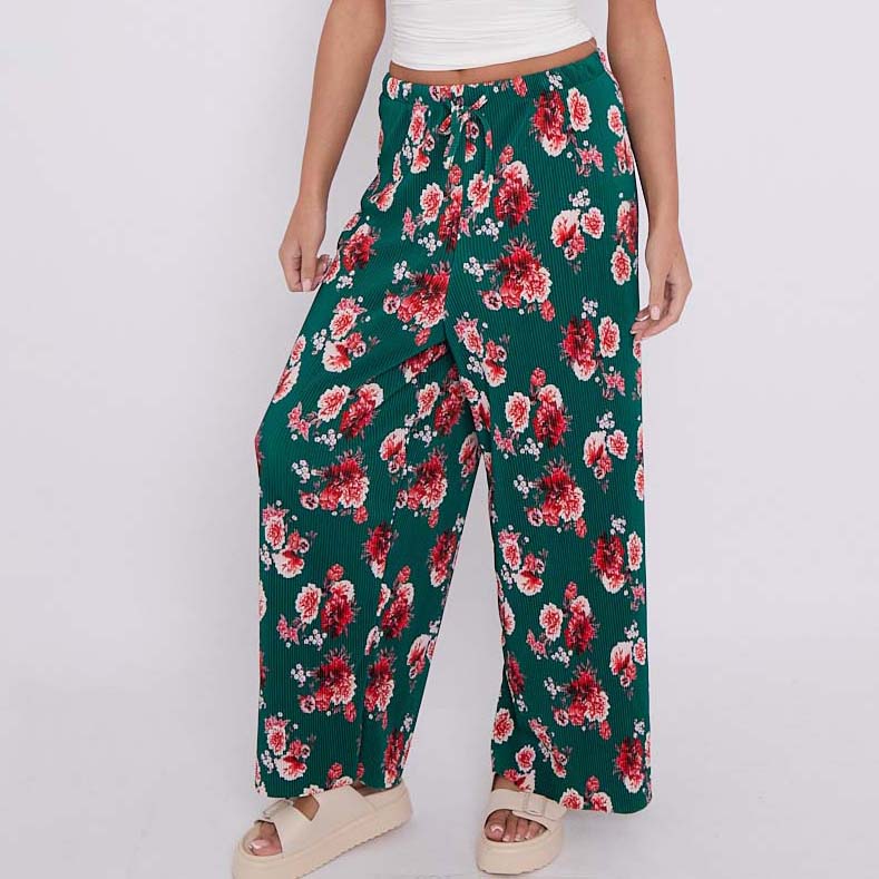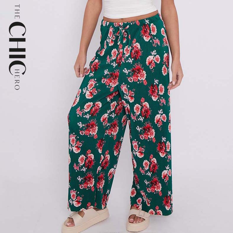 Dark Green Flower Print Abstract Wide-Leg Drawstring Palazzo Pleated Pants
