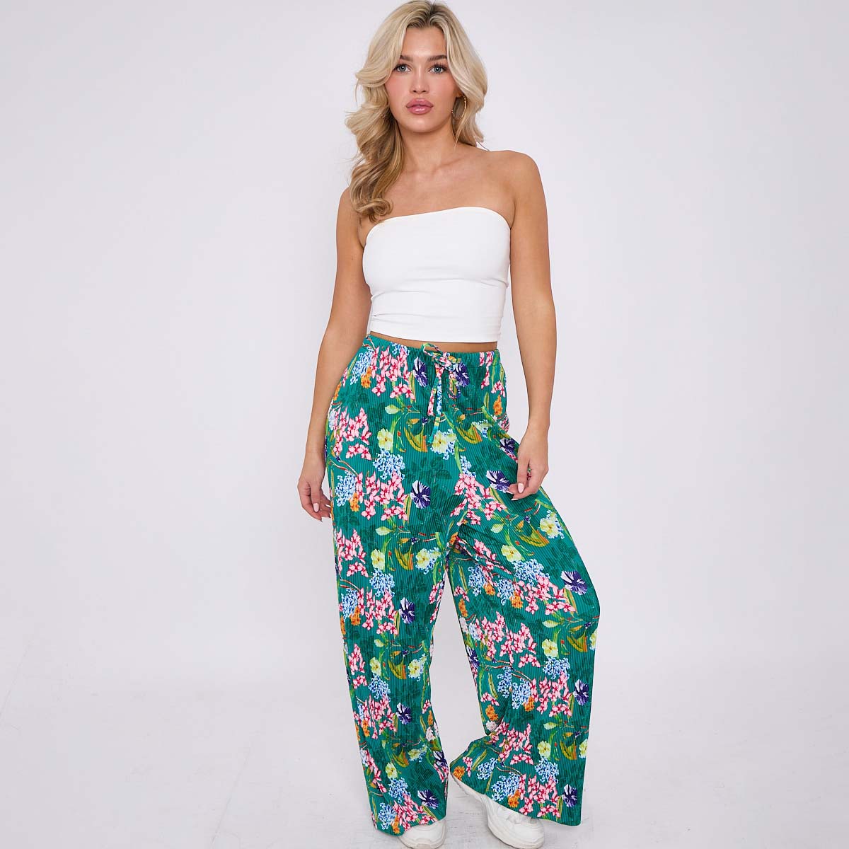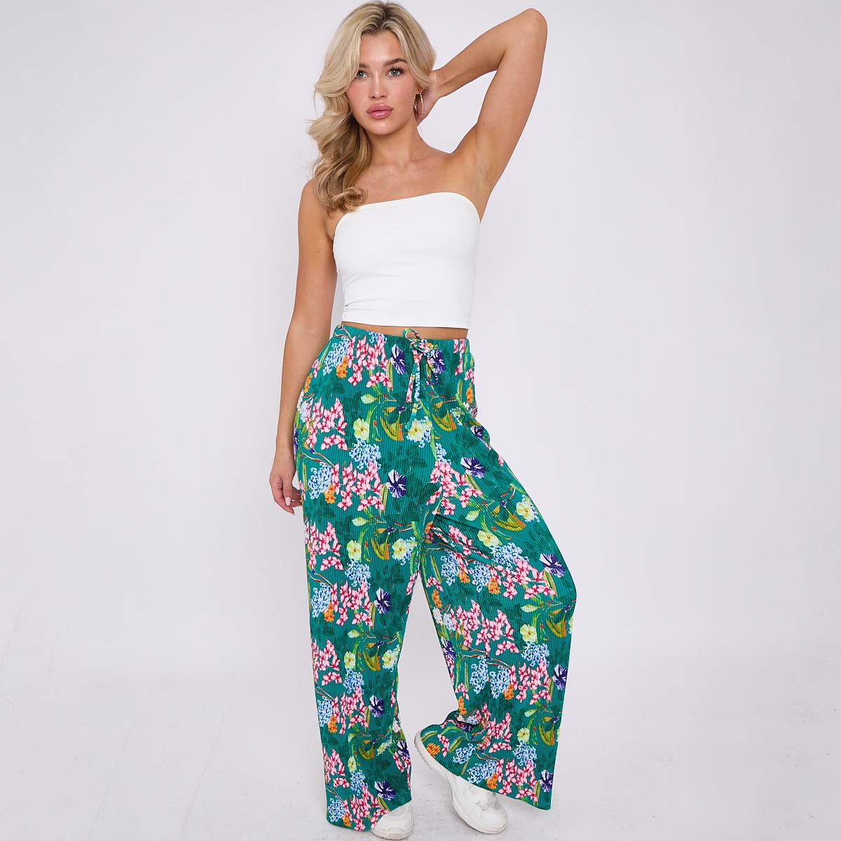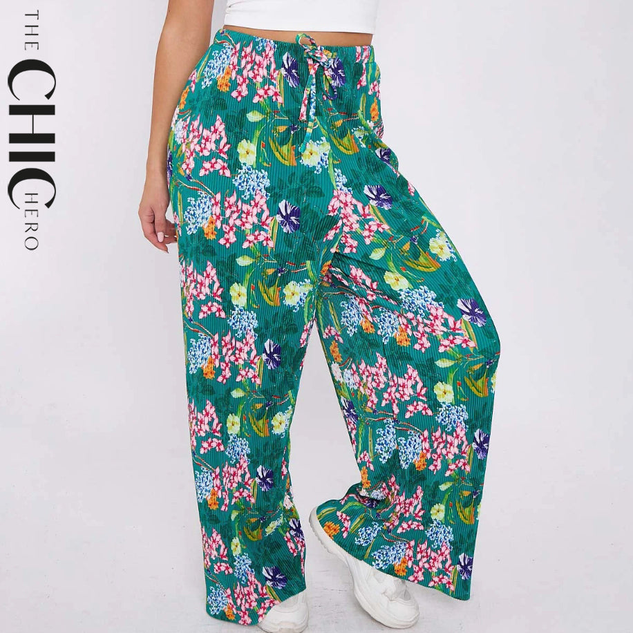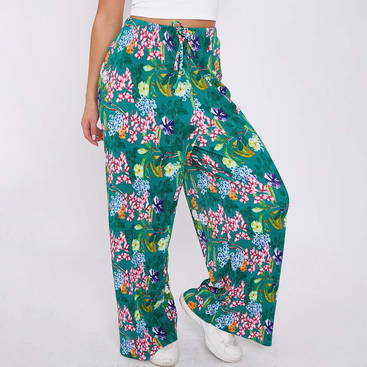 Multicolor Bloom Flower Print Abstract Wide-Leg Drawstring Palazzo Pleated Pants