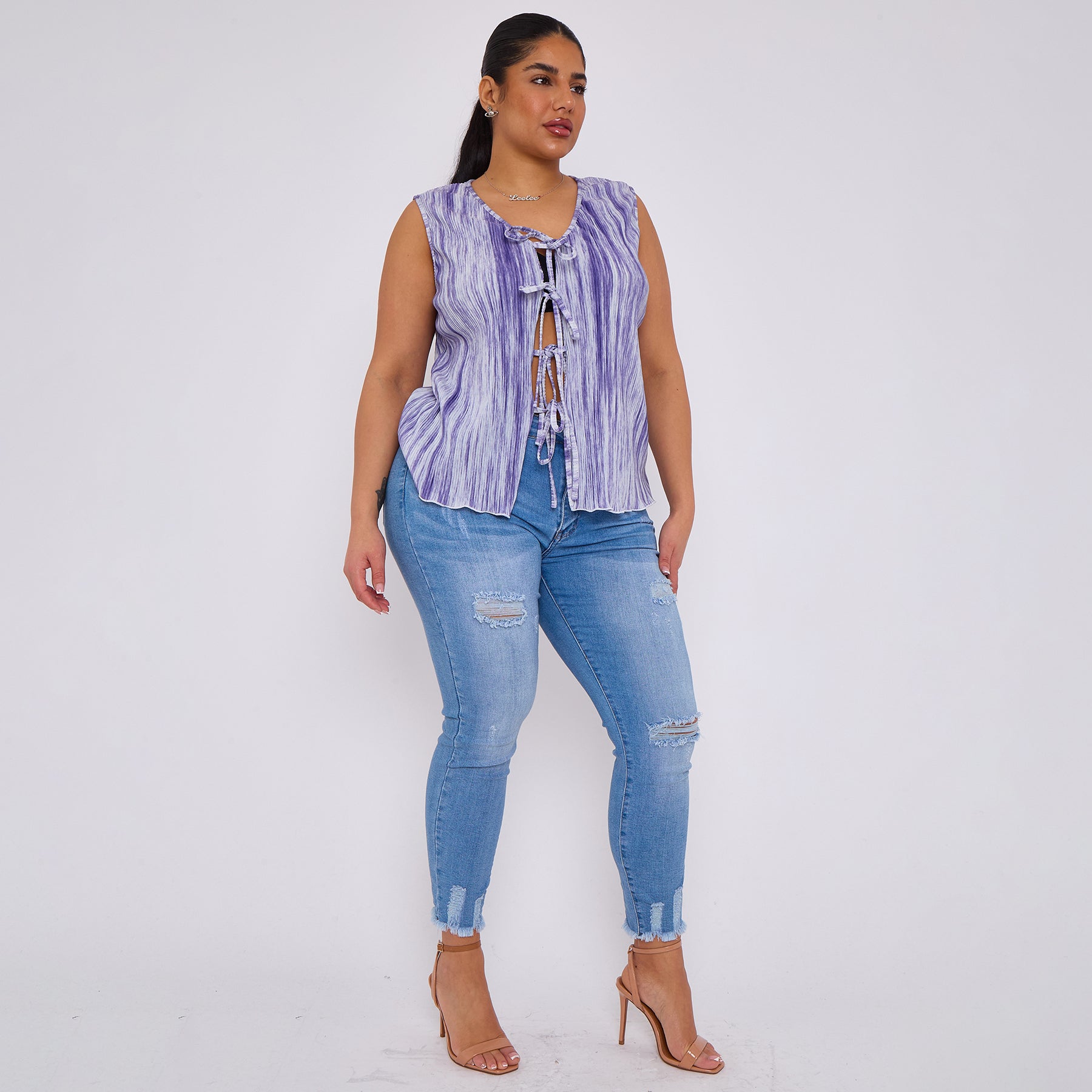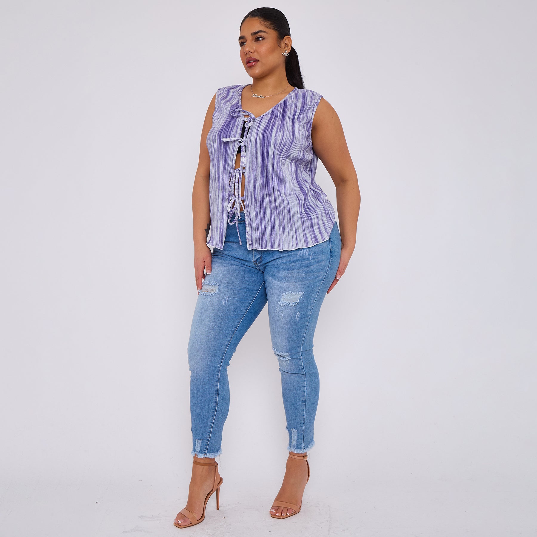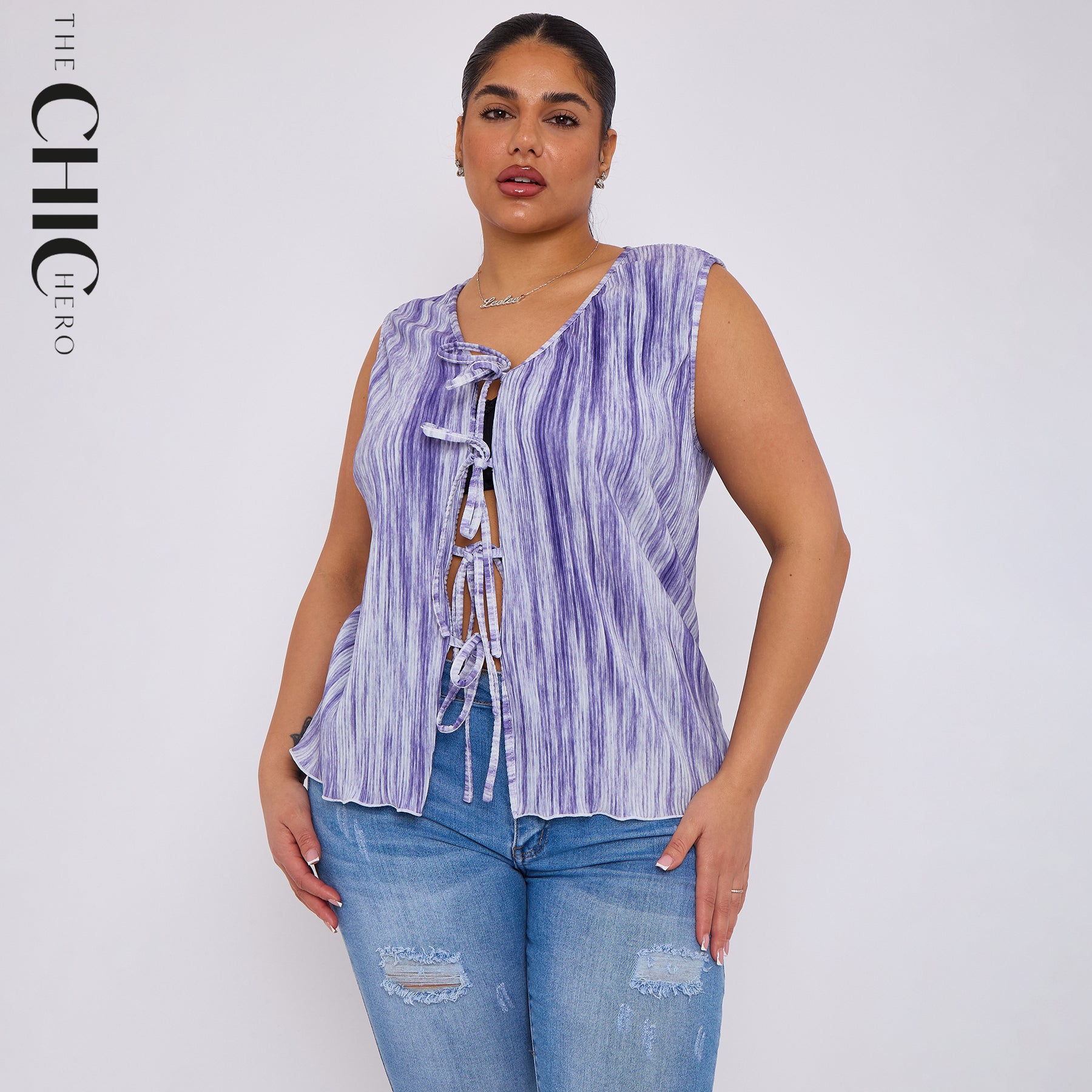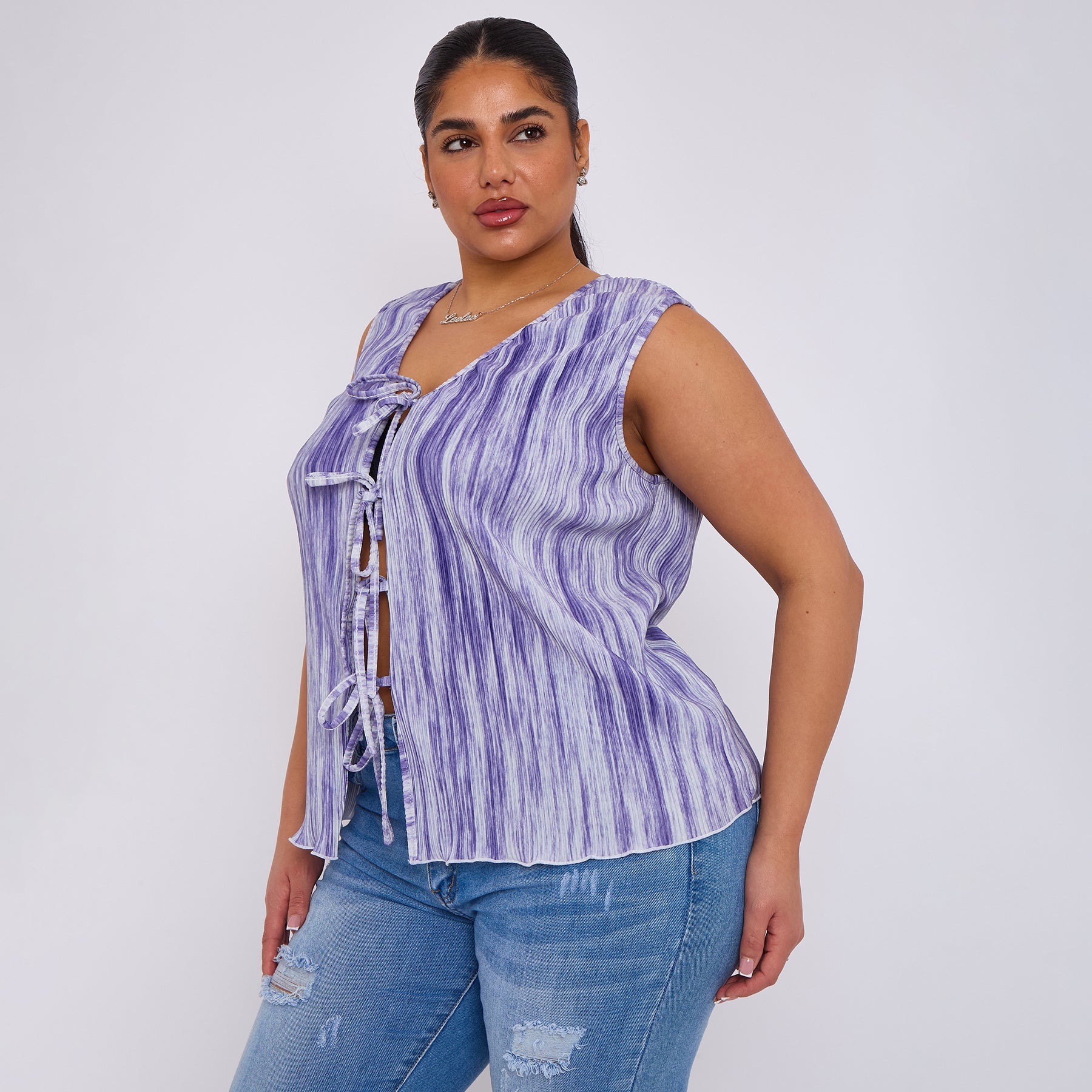 Purple Abstract Geometric Printed Stretchy Pleated V Neck Lace-up Sleeveless Shirt